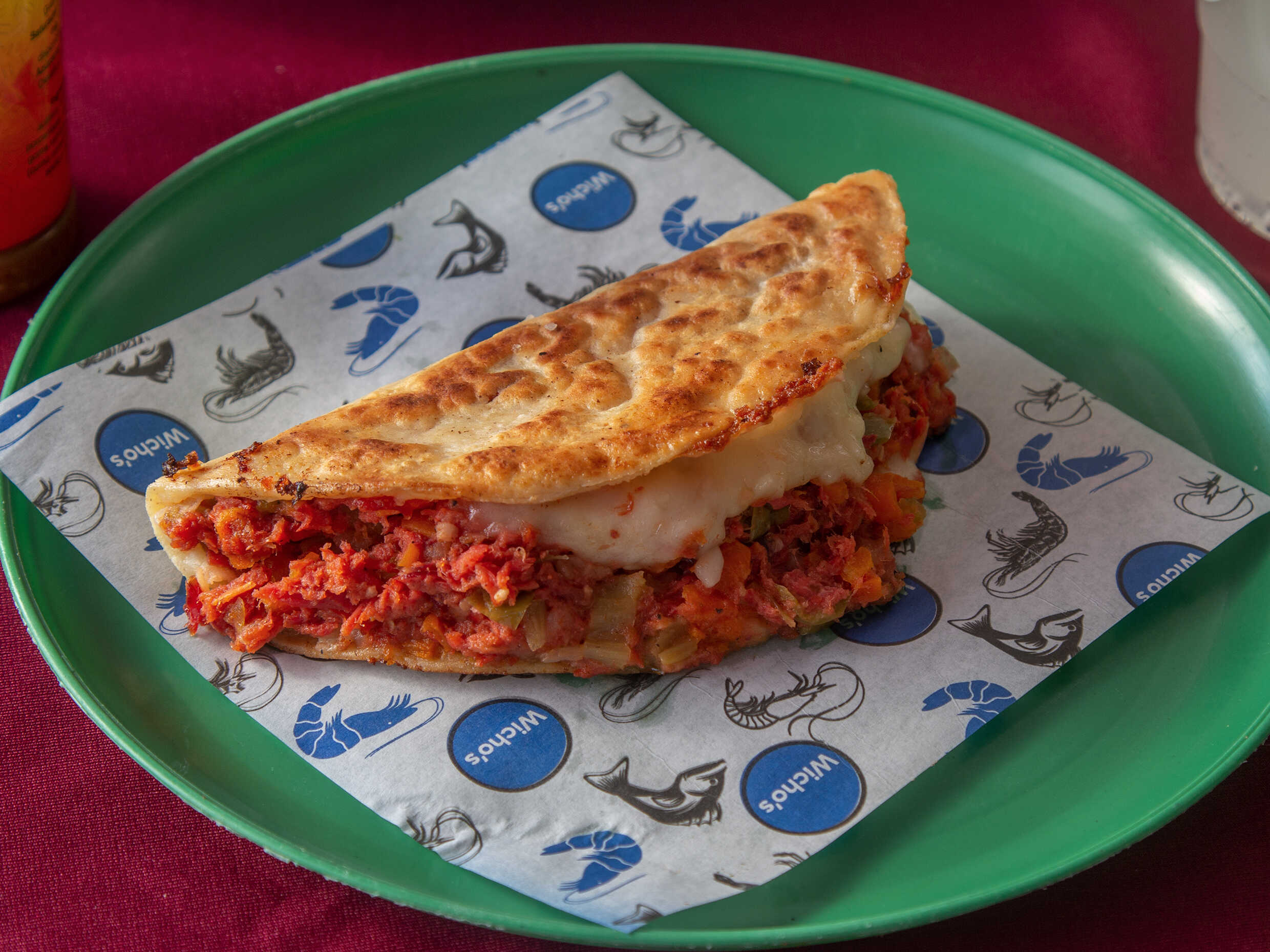 QUESADILLA DORADA RELLENA DE UNA EXQUISITA COMBINACIÓN DE CAMARON CON CEBOLLA