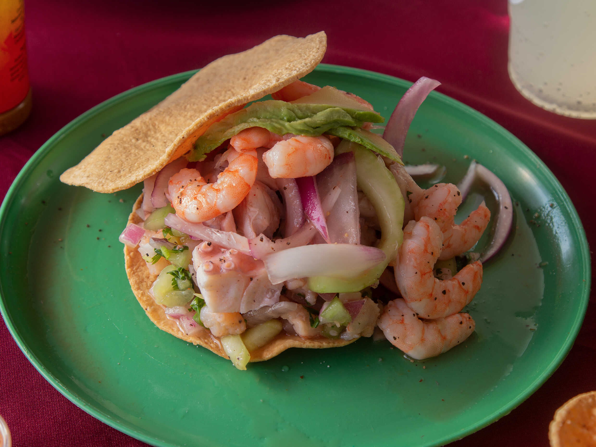 FRESCA TOSTADA PREPARADA, CON UNA CAMA DE CEVICHE DE CAMARÓN, CAMARÓN COCIDO Y PULPO, ACOMPAÑADA DE CEBOLLA MORADA PEPINO Y AGUACATE, BAÑADA CON UNA MESCLA ESPECIAL DE LA CASA A BASE DE CLAMATO