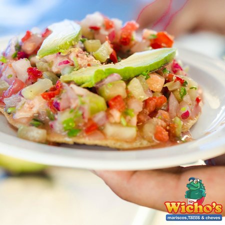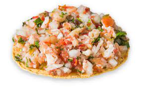 FRESCA TOSTADA PREPARADA, CON UNA CAMA DE CEVICHE DE CAMARÓN, CAMARÓN COCIDO Y PULPO, ACOMPAÑADA DE CEBOLLA MORADA PEPINO Y AGUACATE, BAÑADA CON UNA MESCLA ESPECIAL DE LA CASA A BASE DE CLAMATO