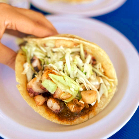 PUEDE SER CAMARON O PULPO, AMBOS LLEVAN UNA CAMA DE ARROZ, TORTILLA YA SEA DE HARINA O MAIZ, BAÑADO CON SU MOJO, DECORADO CON TIRAS DE CEBOLLA