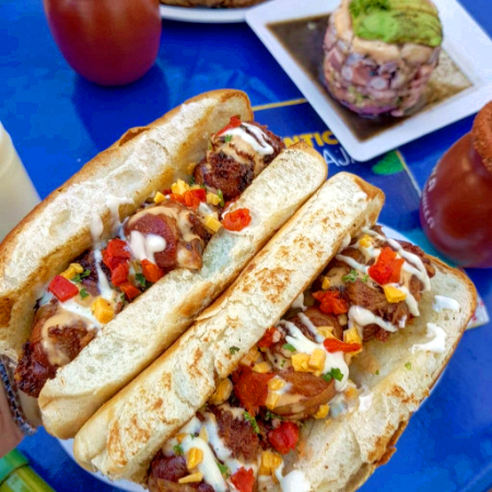ES UN PAN DE DOGGO, MAYONESA, TRES BOLAS DE CAMARON CON MARLIN ENVUELTO EN TOCINO DORADO, ACOMPAÑADO CON TOQUES DE CHIPOTLE, QUESO MOSARELA, PUNTITOS DE CREMA