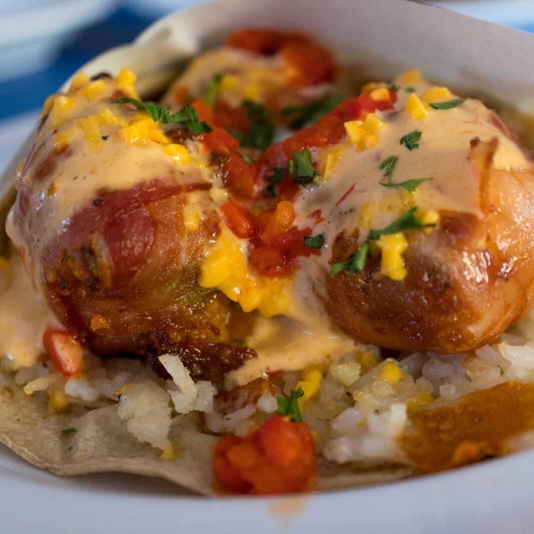 ES UN TACO ACOMPAÑADO CON DE ARROZ BLANCO, TRES BOLITAS CON CAMARON ENVUELTO EN MARLIN Y TOCINO DORADO, ACOMPAÑADO CON CHIPOTLE & UNOS TOQUES DE CHILE MORRON