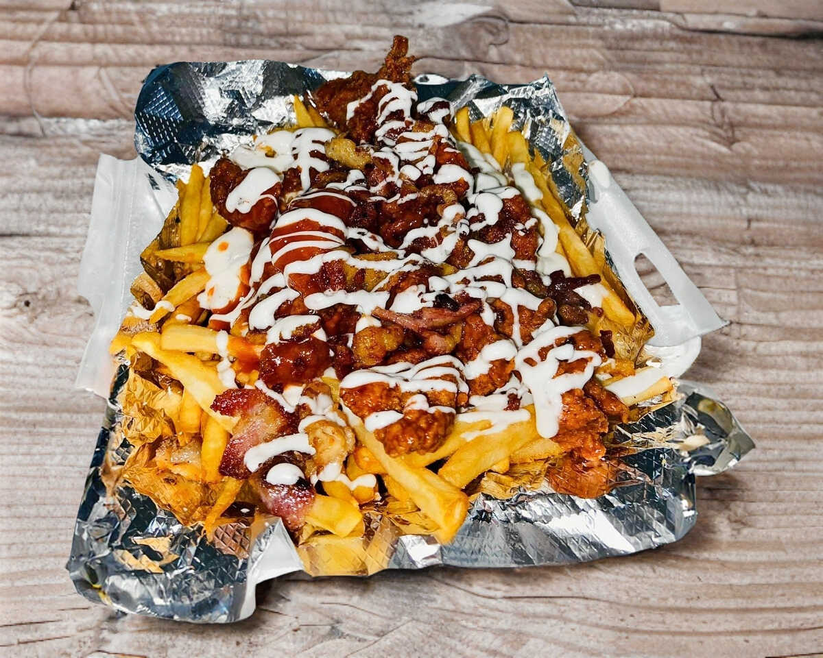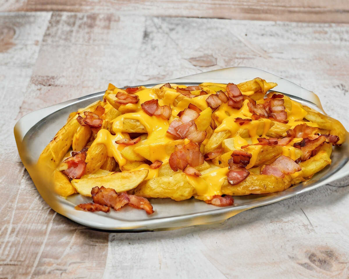 Papas francesas acompañadas con pechuga bañadas en salsa buffalo ,tocino, y aderezo chipotle.