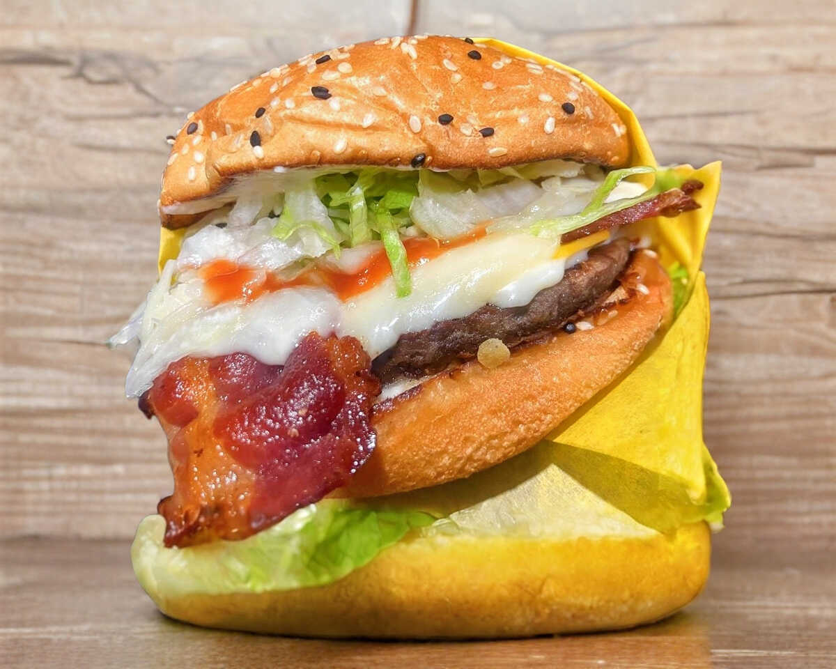 Carne de res, tocino, queso tipo americano, lechuga, tomate, cebolla, pepinillos, cátsup y mostaza. Incluye papas