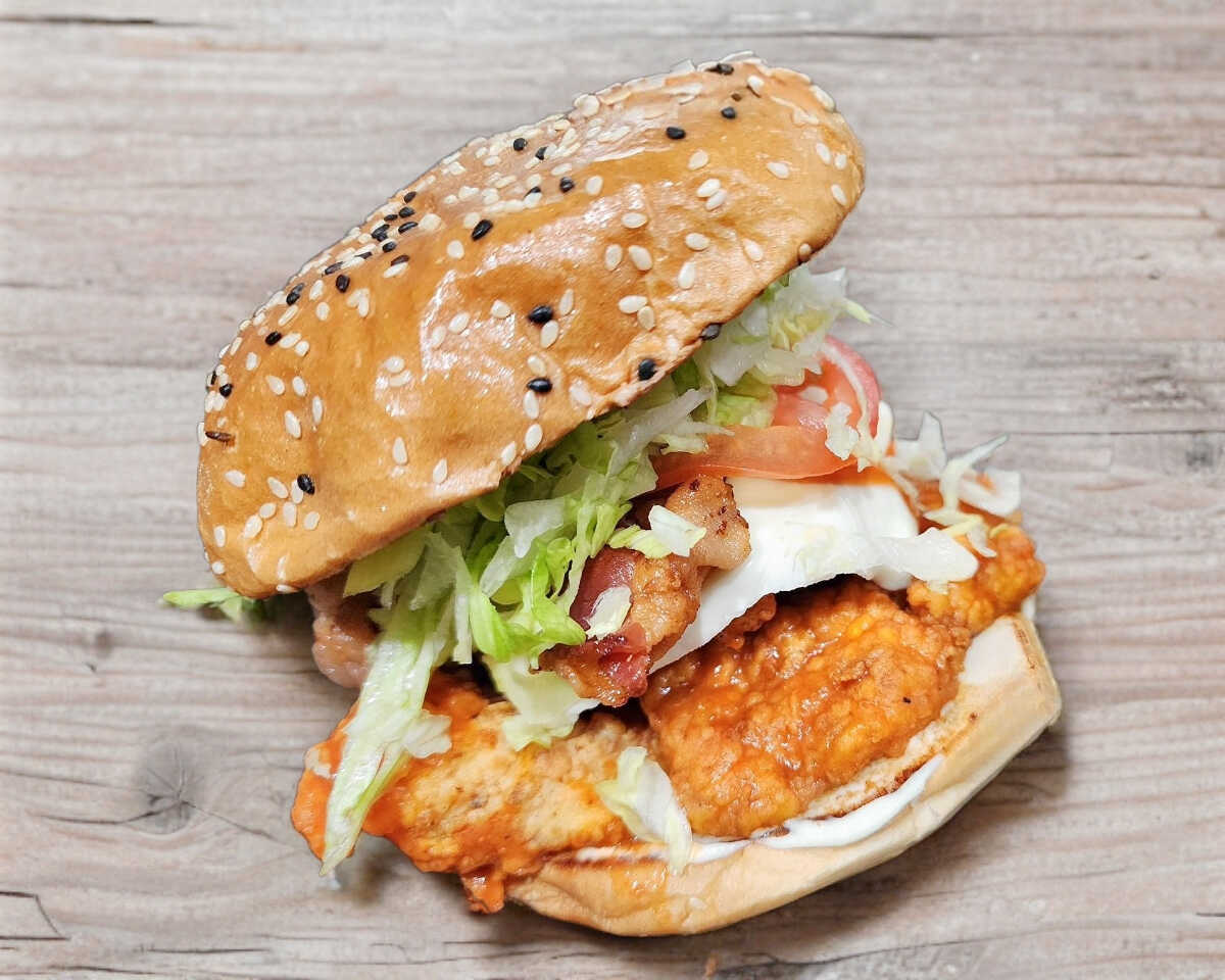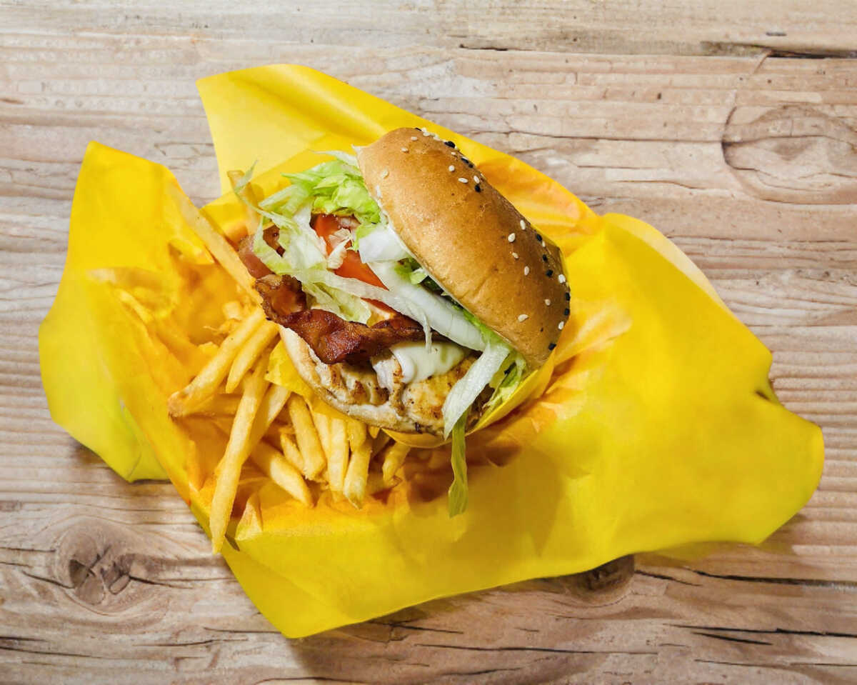 Jugosa pechuga a la plancha, tocino, tomate, cebolla, lechuga y queso manchego.Incluye papas