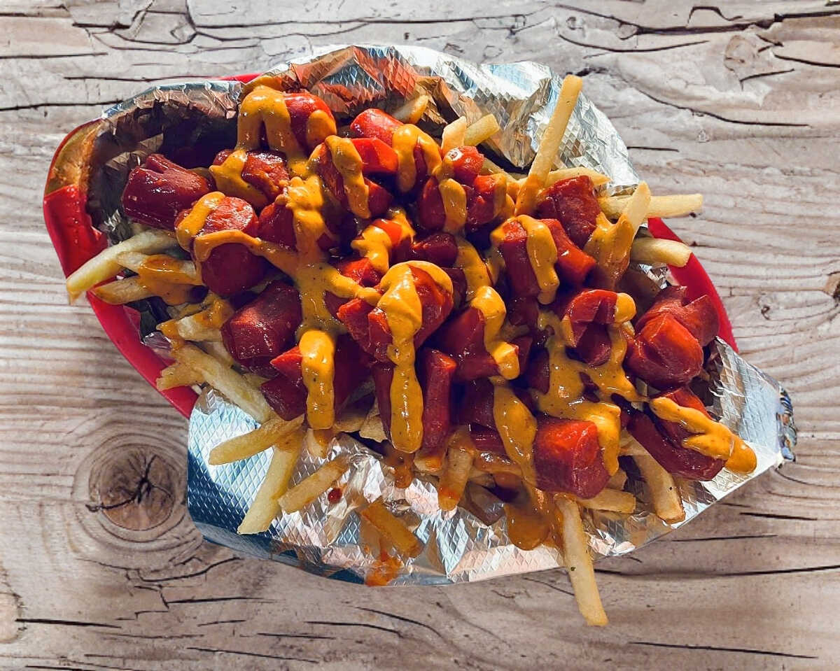 Cama de papas con trocitos de salchichas bañadas en salsa de su elección y aderezo