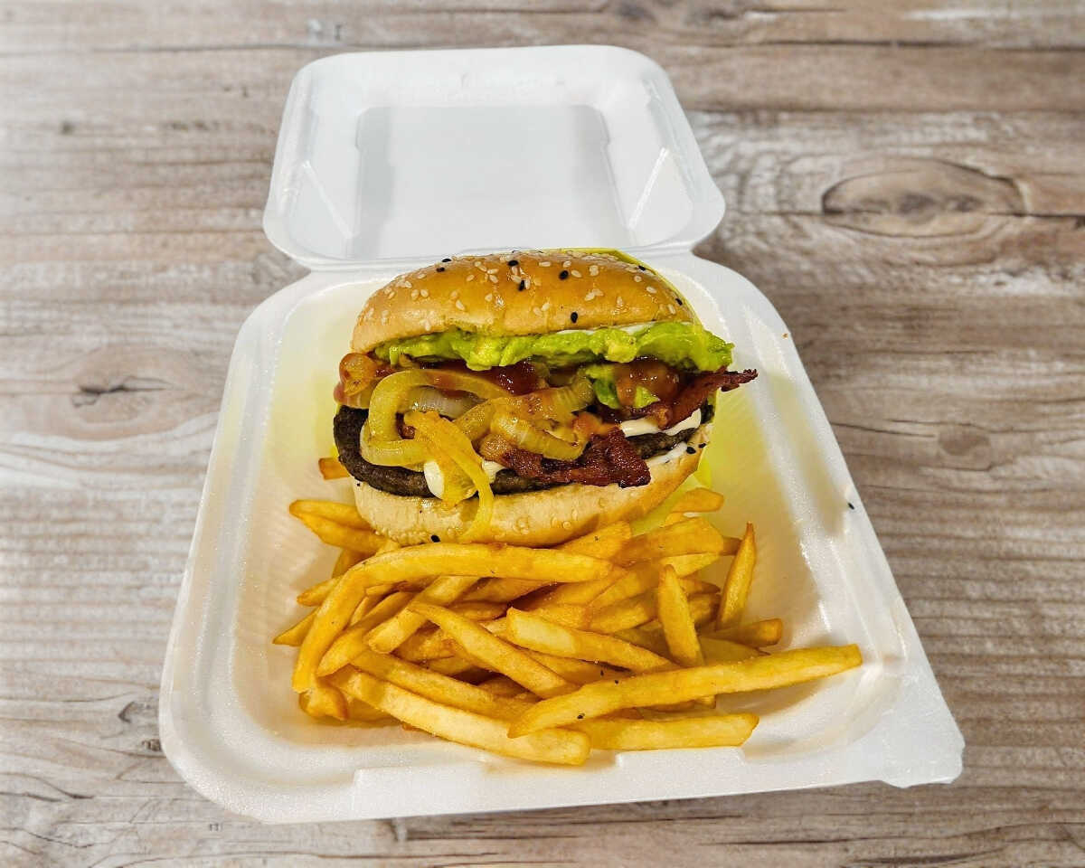Carne de res, queso manchego, tocino, guacamole y cebolla caramelizada.Incluye papas