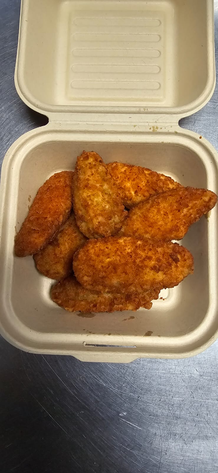 Pollo, sin piel, sin hueso y en tiras, leche, para marinar el pollo, mantequilla, derretida, para marinar, salsa picante, para marinar el pollo, huevos, harina, ajo en polvo, paprika, pimienta molida, sal, polvo para hornear y aceite vegetal.Incluye papas y una soda de lata