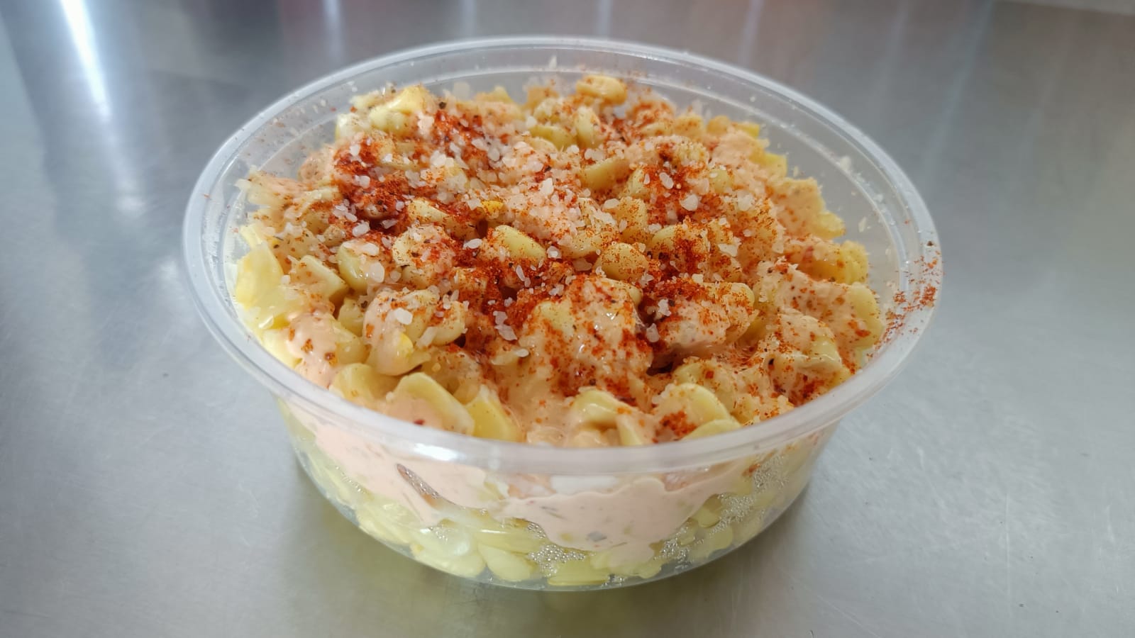 8 Oz de Elote desgranado con Chipotle, Crema y Queso Parmesano con un toque de especies de la casa.