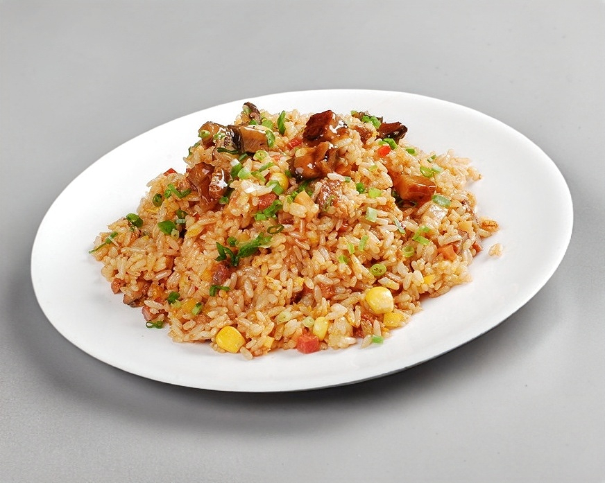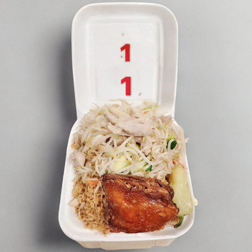 Combinación china, arroz con pollo, chile asado.
