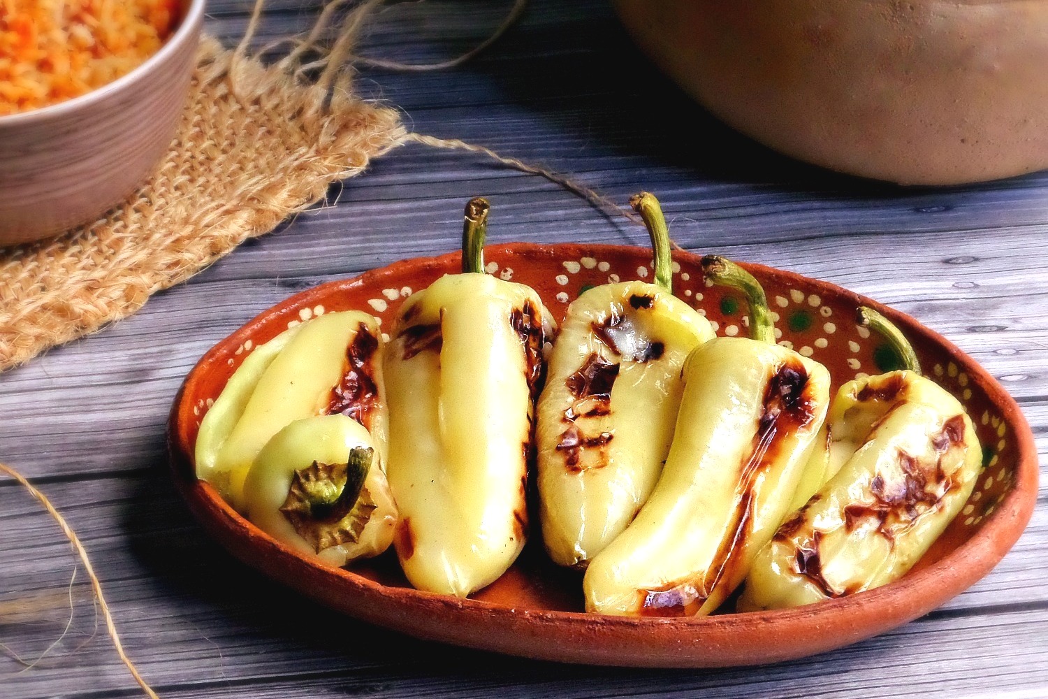 Pollo picoso, arroz con pollo, chile asado.