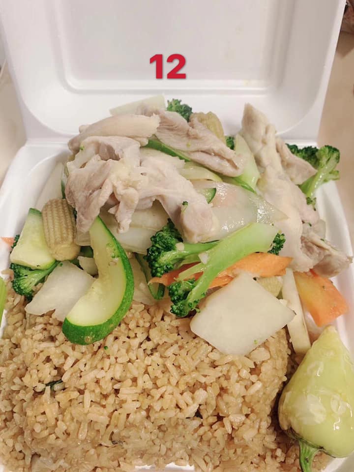 Pollo con verdura al vapor, arroz con pollo, chile asado.