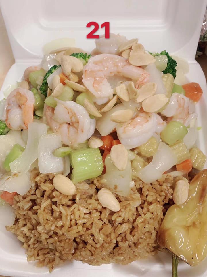 Caldo de aleta de tiburón, arroz con camarones, chop suey con camarones, combinación china, camarón enchilado.