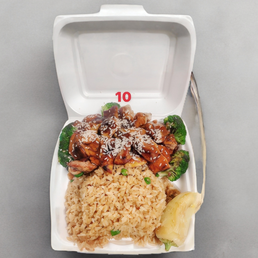 Pollo teriyaki, arroz con pollo, chile asado.