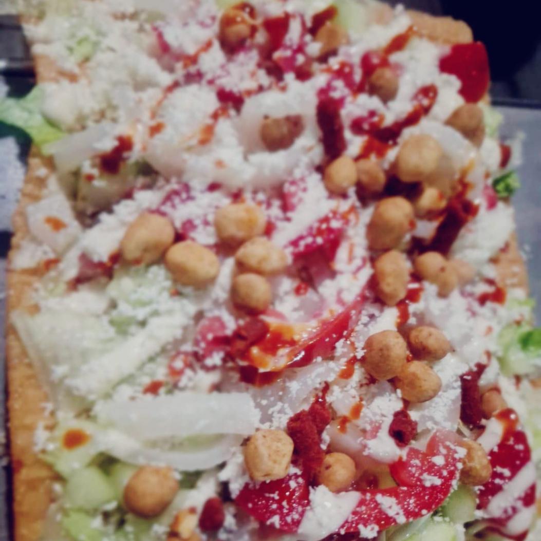 Fritura rectangular con mayonesa lechuga pepino tomate cueritos queso cacahuate y chachachaca. Favor de indicar si preparado o separado