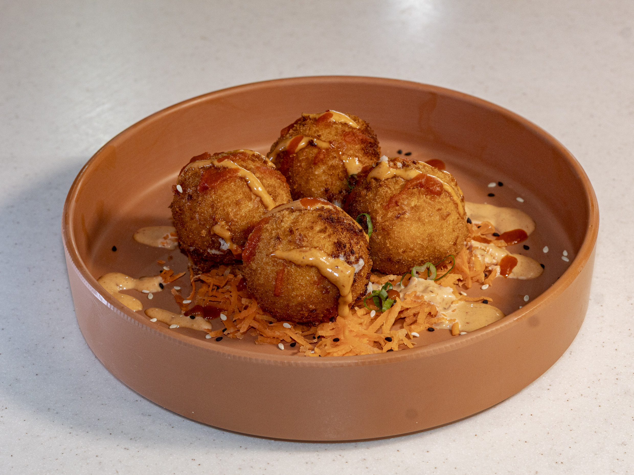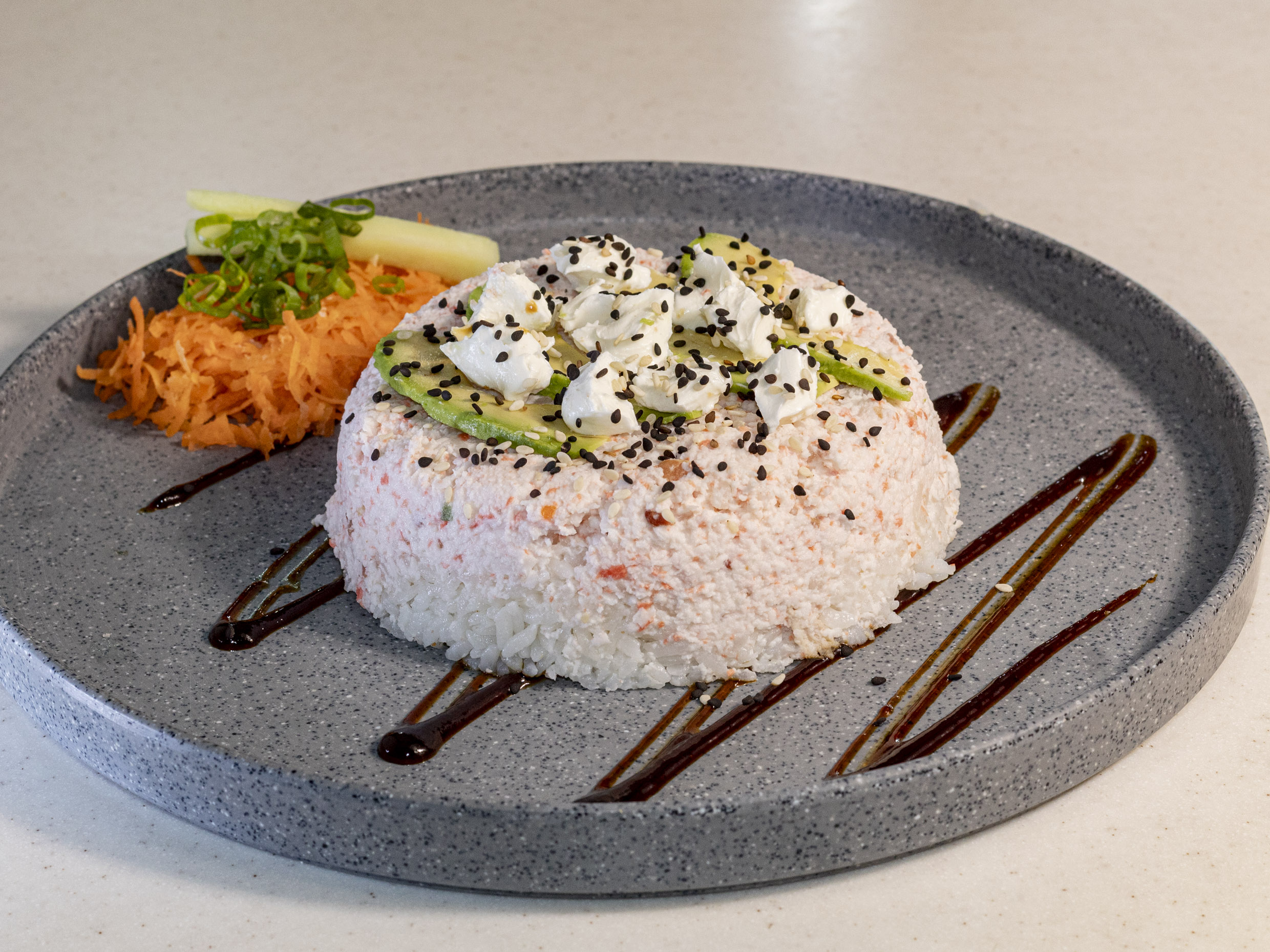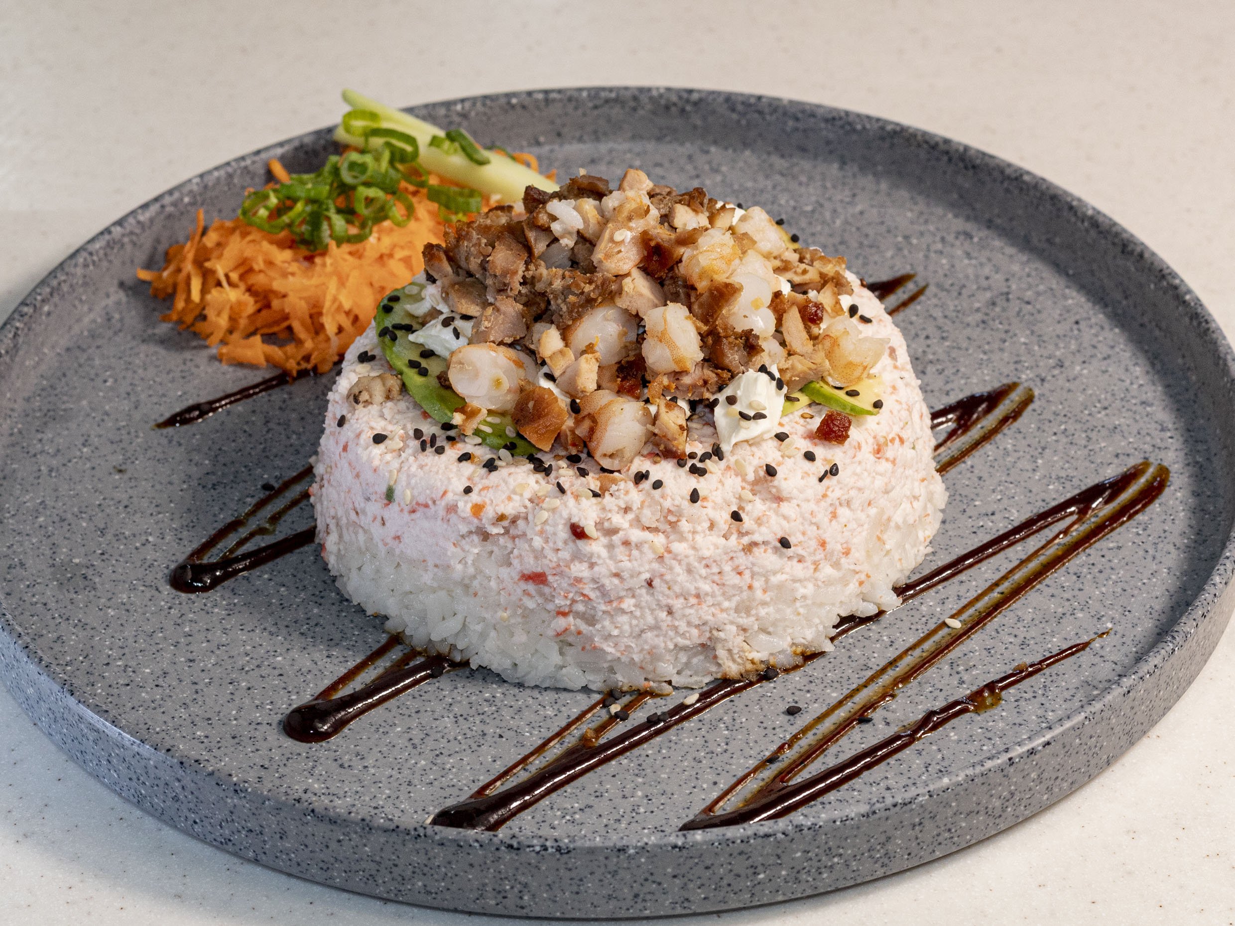 Bola de arroz con tampico, queso, pollo, res, camarón empanizado. Servido en una cama de tampico, con aguacate por fuera y bañada en salsa de anguila.