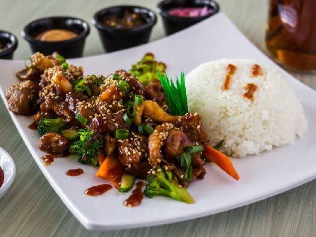 Proteinas a la plancha con verduras en cama de arroz blanco banado con salsa teriyaki.