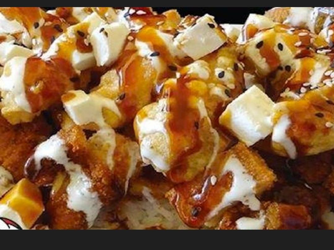 pollo empanizado , queso crema cubito en cama arroz blanco banado con salsa chipotle, salsa anguila y ajonjoli (Porcion personal)