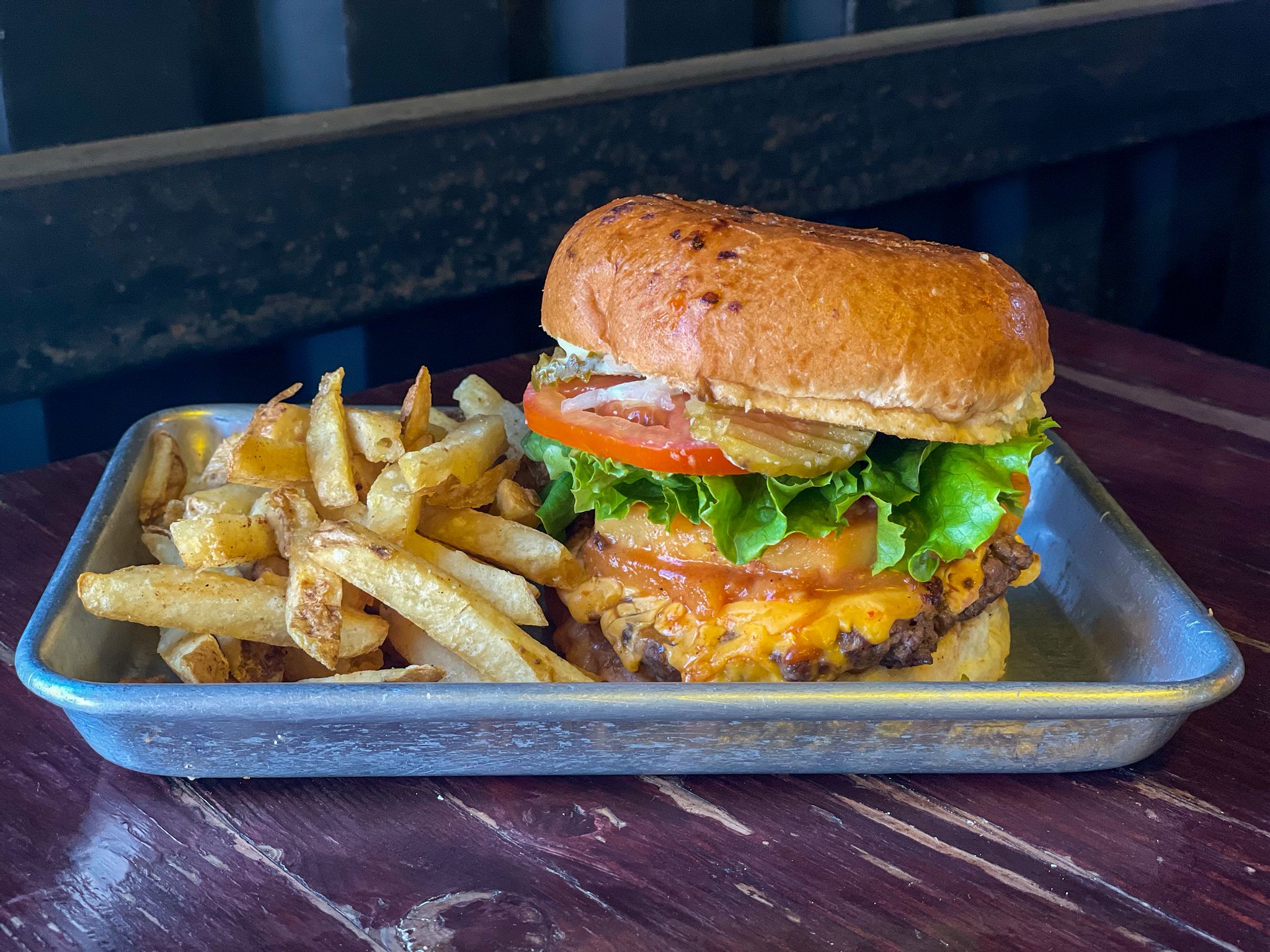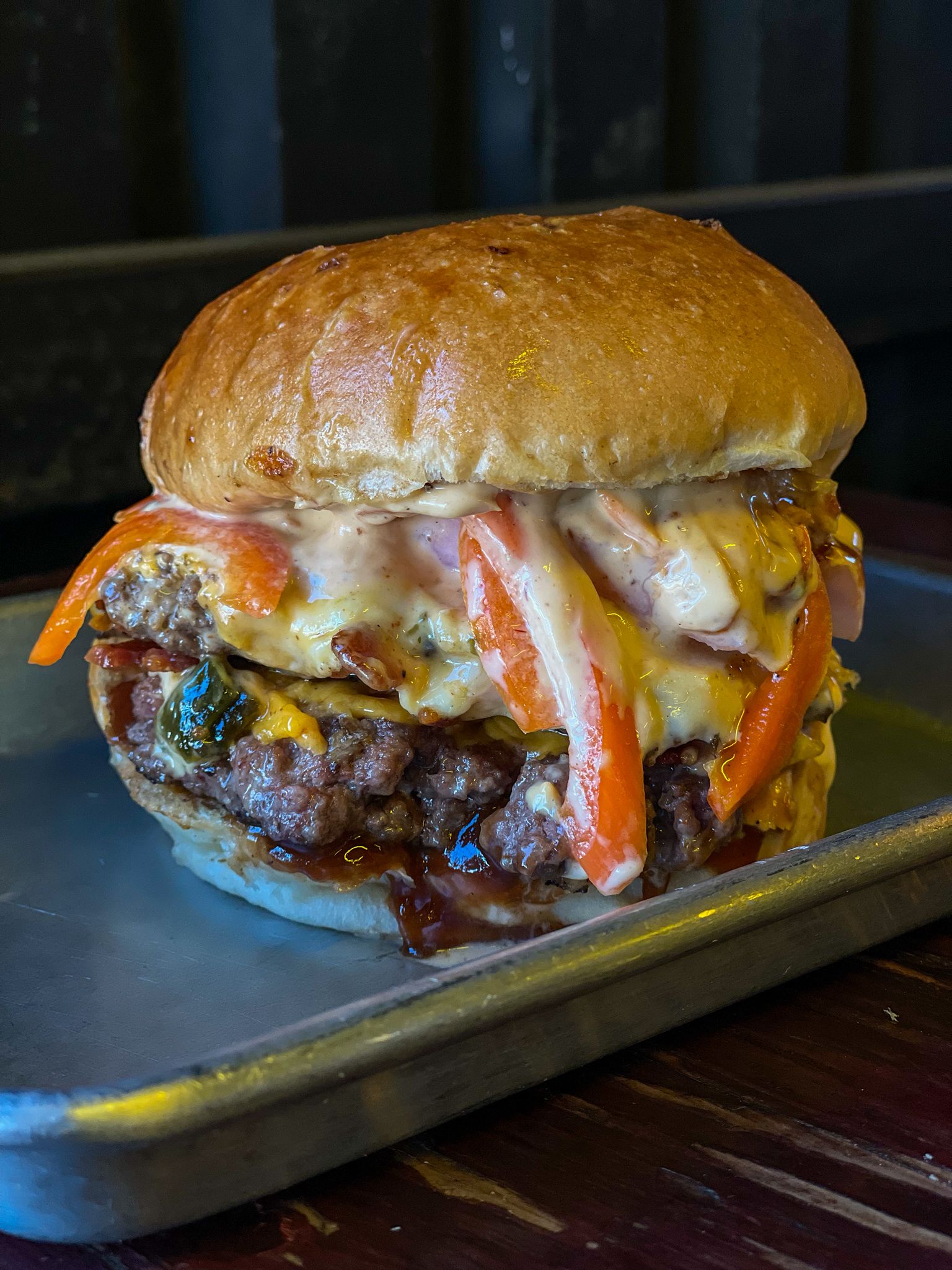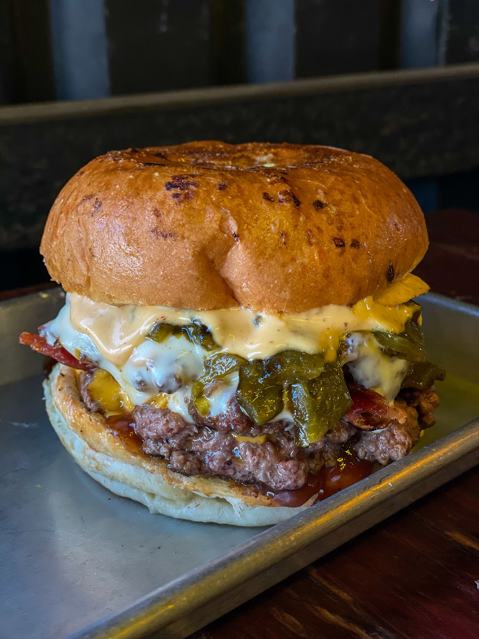 Doble carne, queso cheddar, tocino, mermelada de chile poblano, aderezo de chile de árbol.