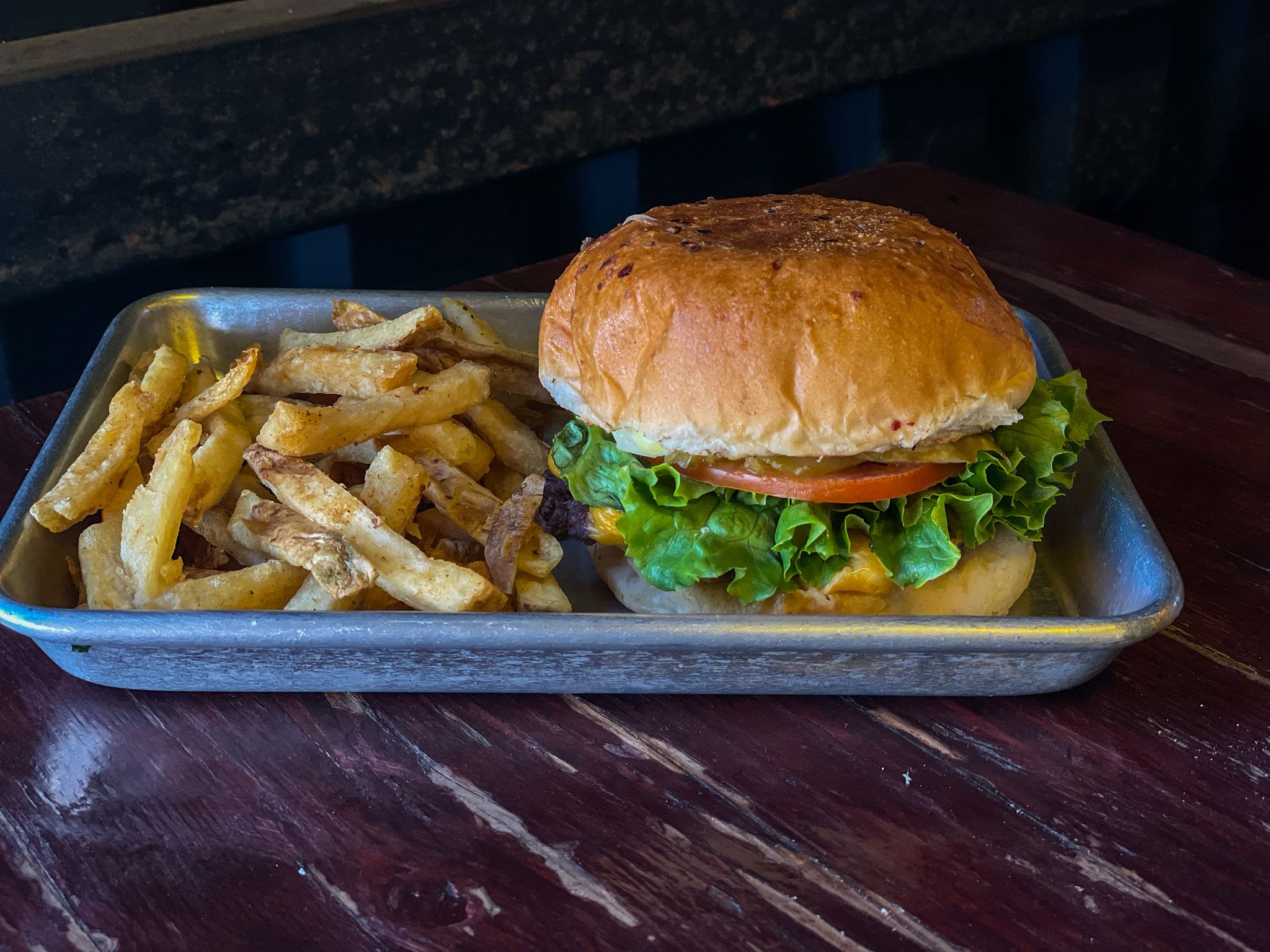 Carne, queso cheddar, tomate, lechuga, cebolla, pepinillo y mayonesa de la casa.
