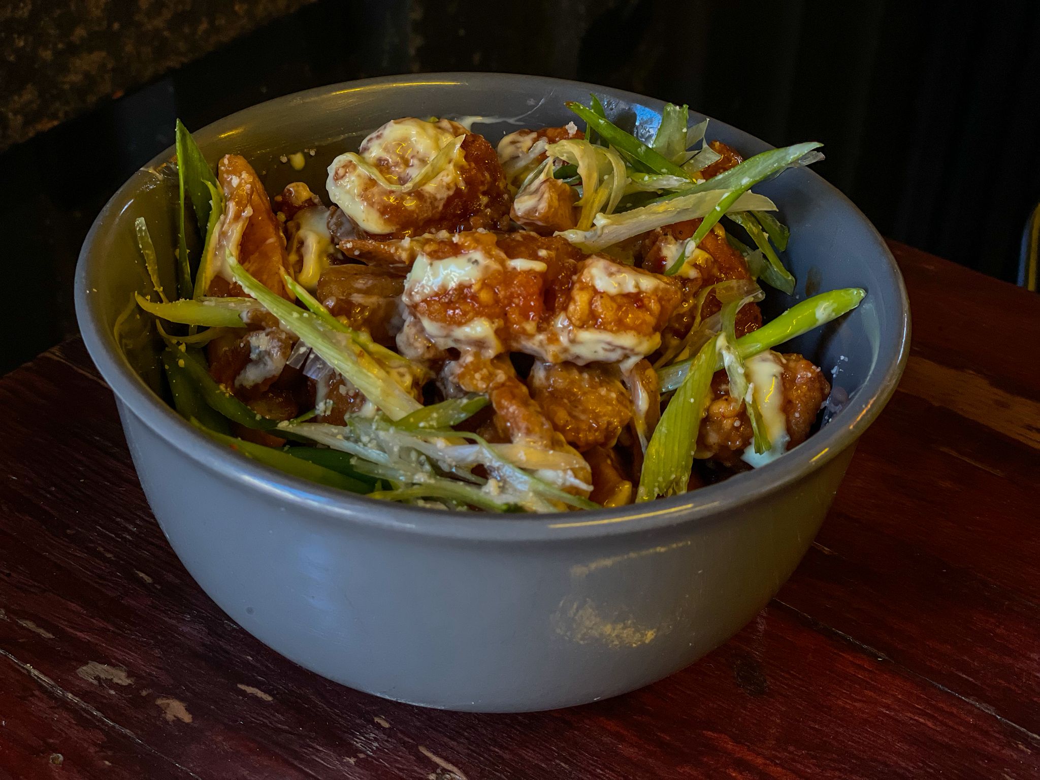 Trozos de pollo crujiente bañados en salsa agridulce, acompañados de papas. Se sirve con aderezo ranch y queso parmesano.