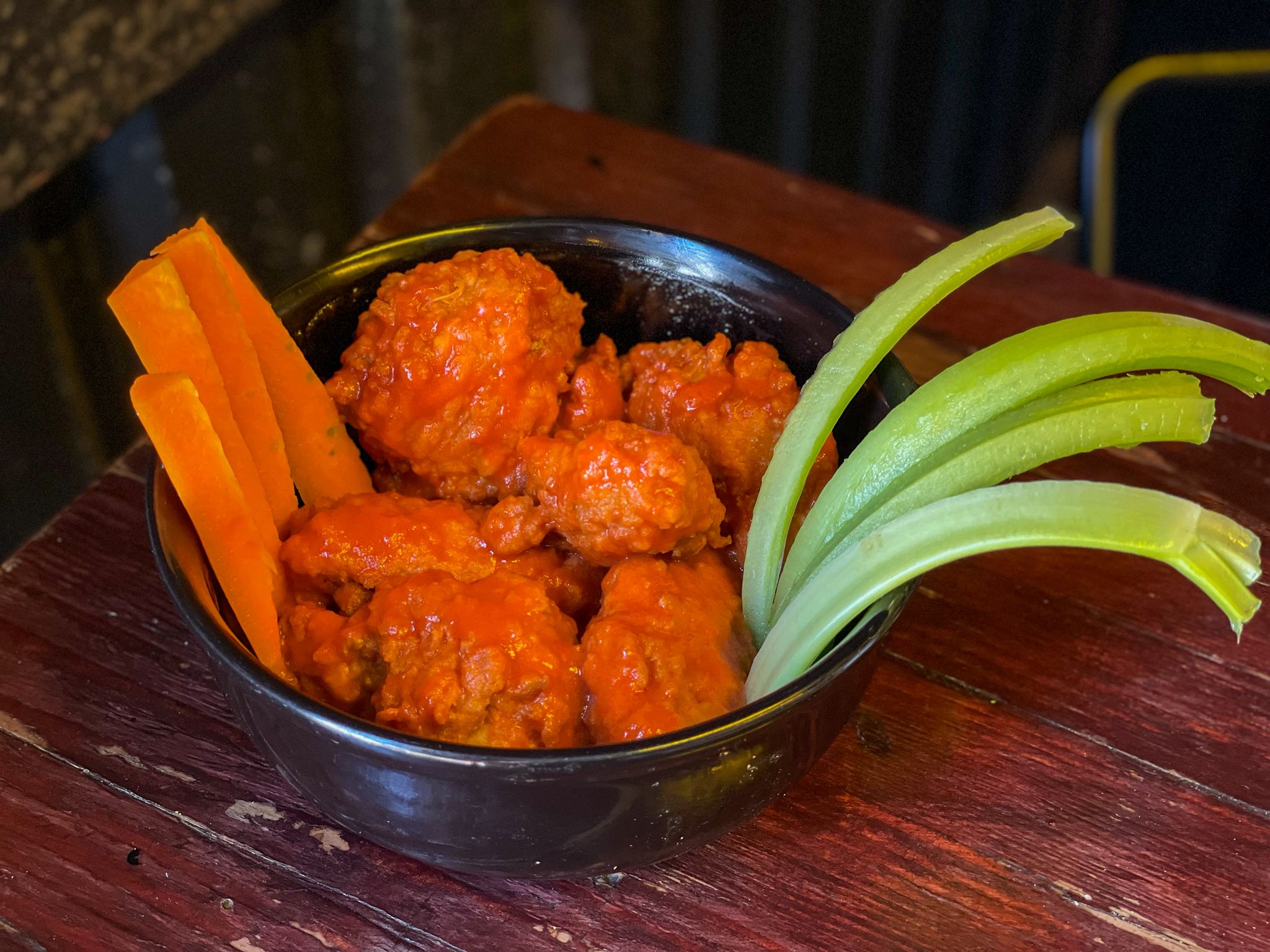 Alitas de pollo en salsa búfalo, acompañadas con apio y zanahoria.