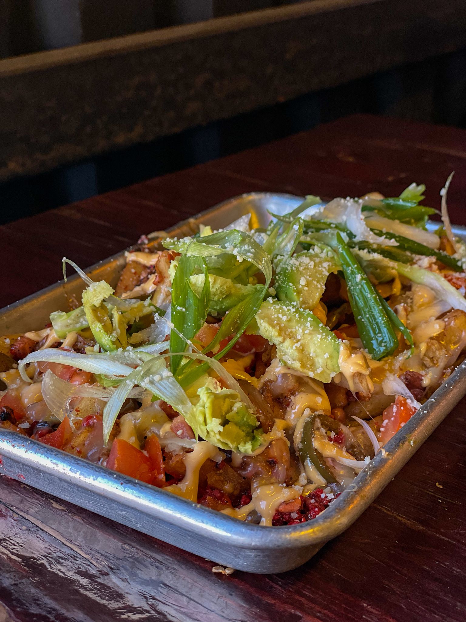 Papas fritas cubiertas con carne asada, cebolla caramelizada, chile jalapeño, aguacate y aderezo de chile de árbol.