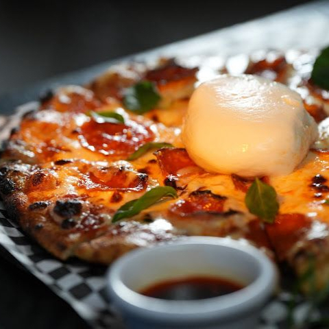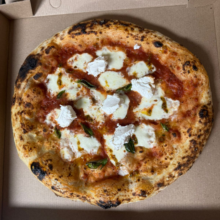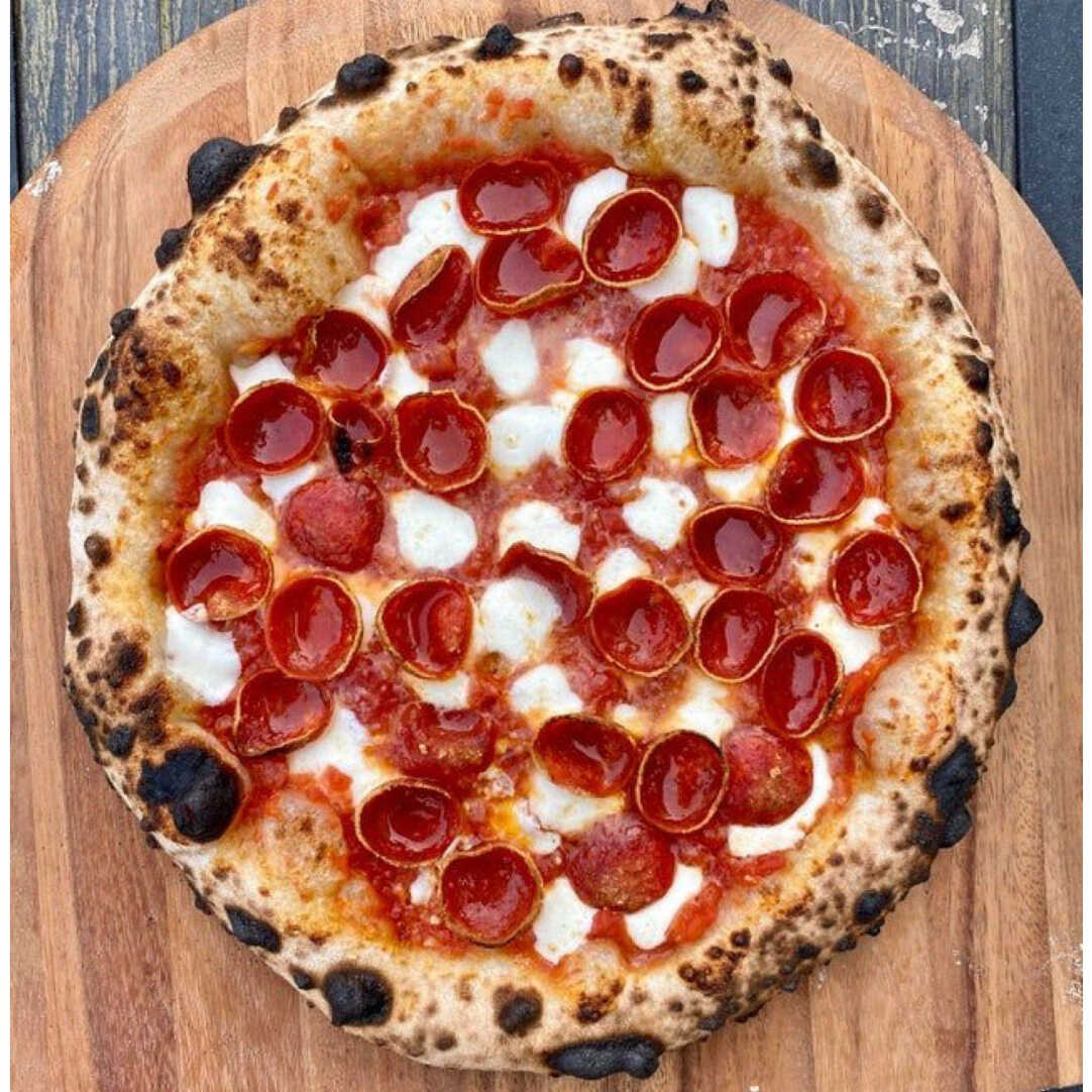 Pizza clásica de pepperoni elevada con el toque cremoso y distintivo del queso burrata.