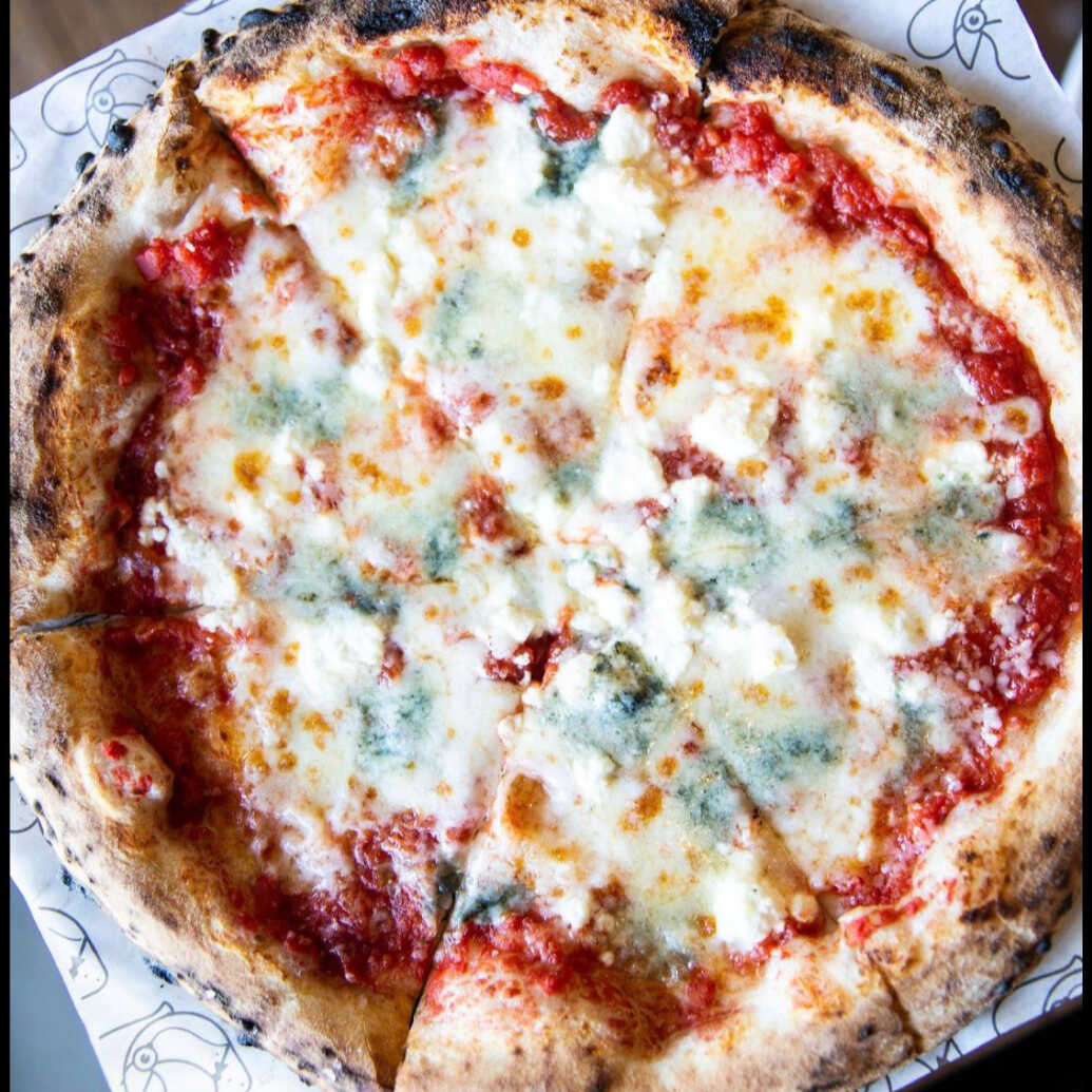 Pizza de pepperoni clásico acompañada con la intensidad del queso azul y rugula fresca.
