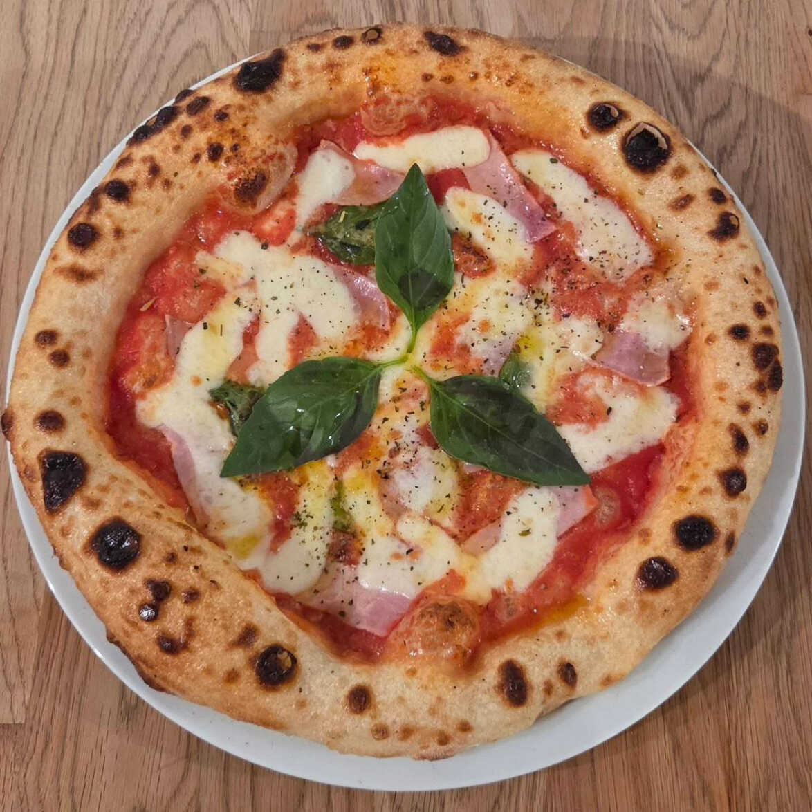Deliciosa y sencilla pizza cubierta con láminas de jamón de pierna y queso.