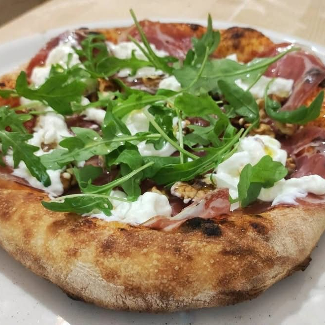 Deliciosa pizza artesanal preparada con jamón serrano, tomates cherry, rugula fresca, queso burrata cremoso y queso parmesano.