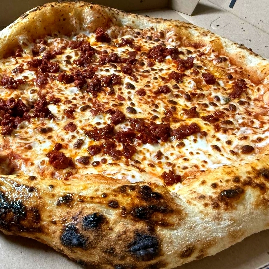 Pizza artesanal con el sabor intenso del chorizo bien dorado sobre queso mozzarella.