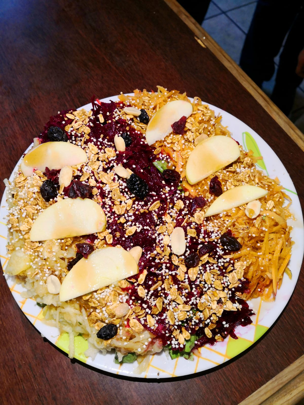 Betabel, zanahoria, lechuga, jícama, cereales y aderezo de miel.