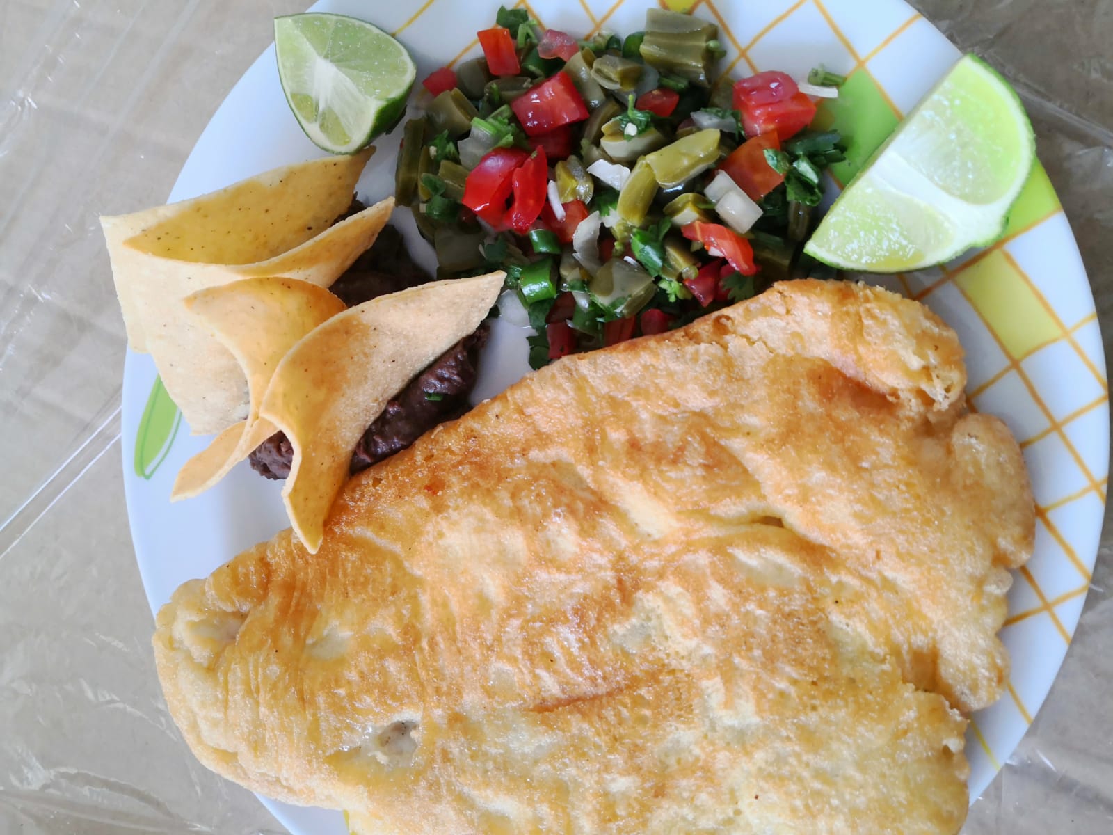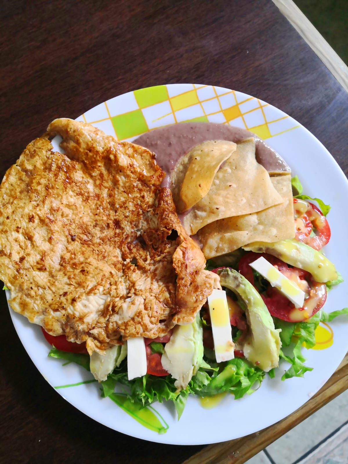 Omelette relleno de jamón y queso panela, acompañado de pico de gallo y frijoles refritos