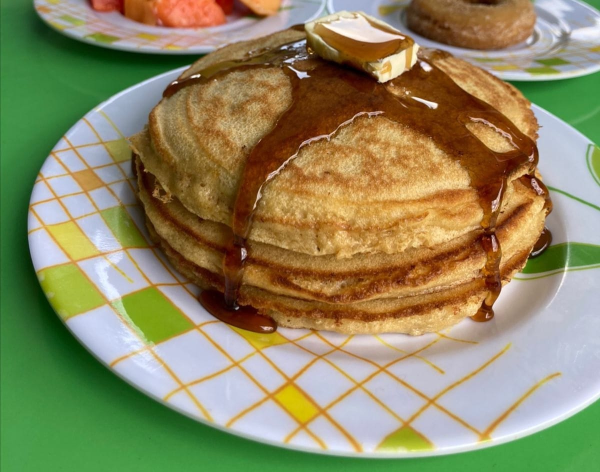Tres deliciosos hot cakes acompañados de mermelada y mantequilla.