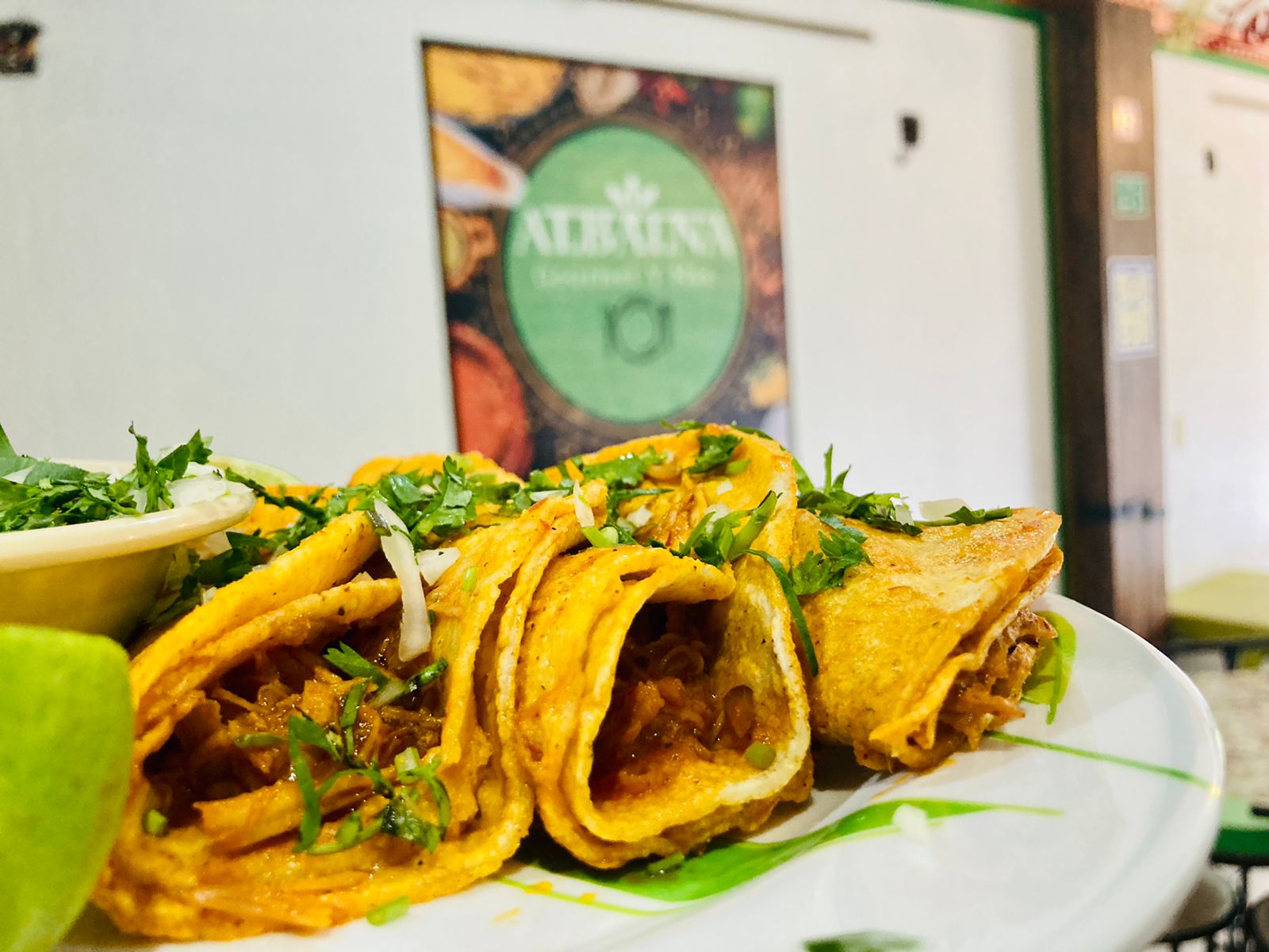 Tres deliciosos tacos de cochinita pibil, receta de la casa.