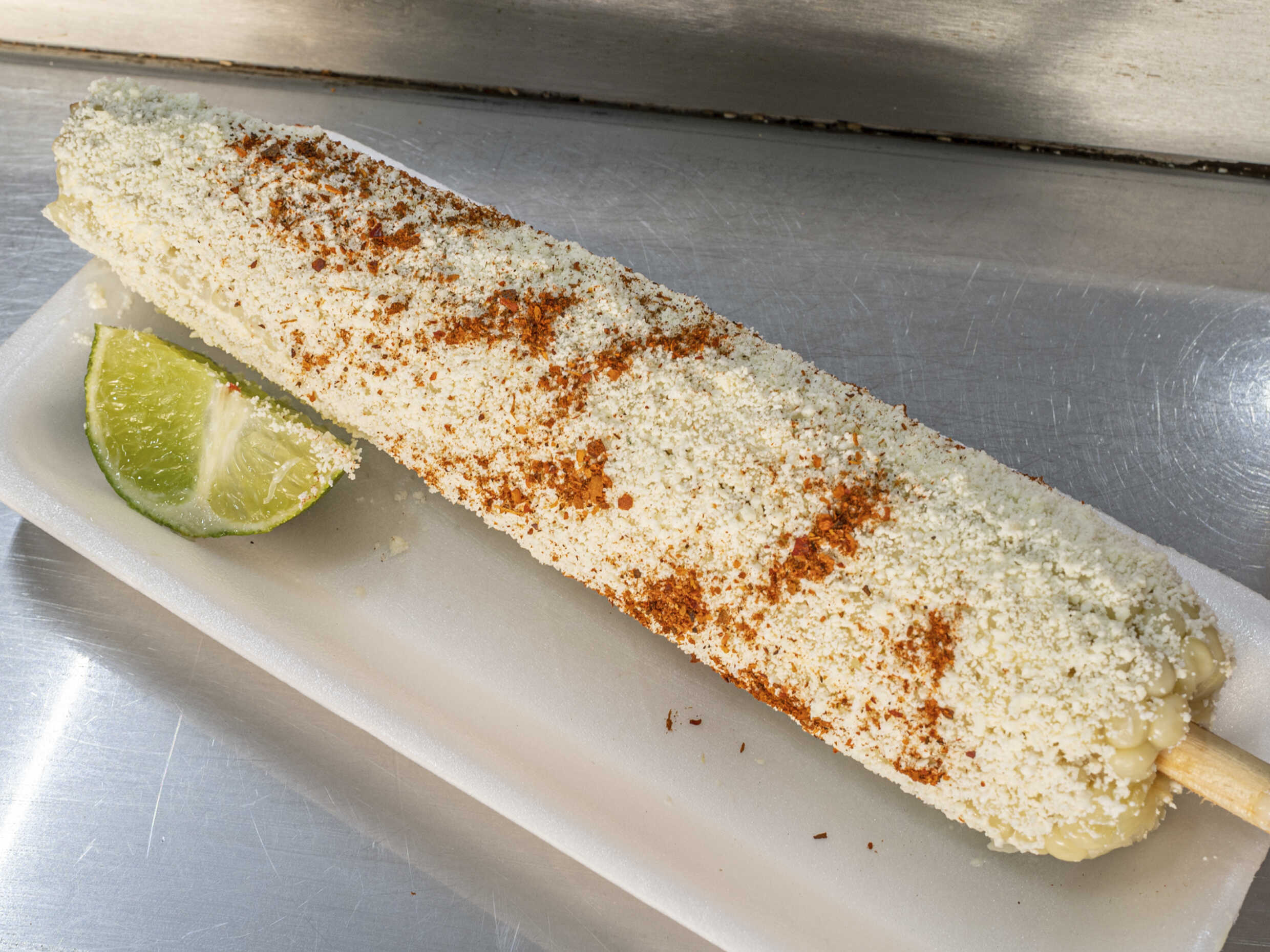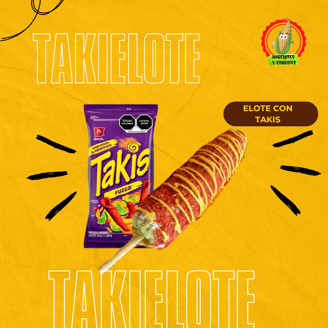 Elote con mayonesa, queso limón y cubierta de takis molidos