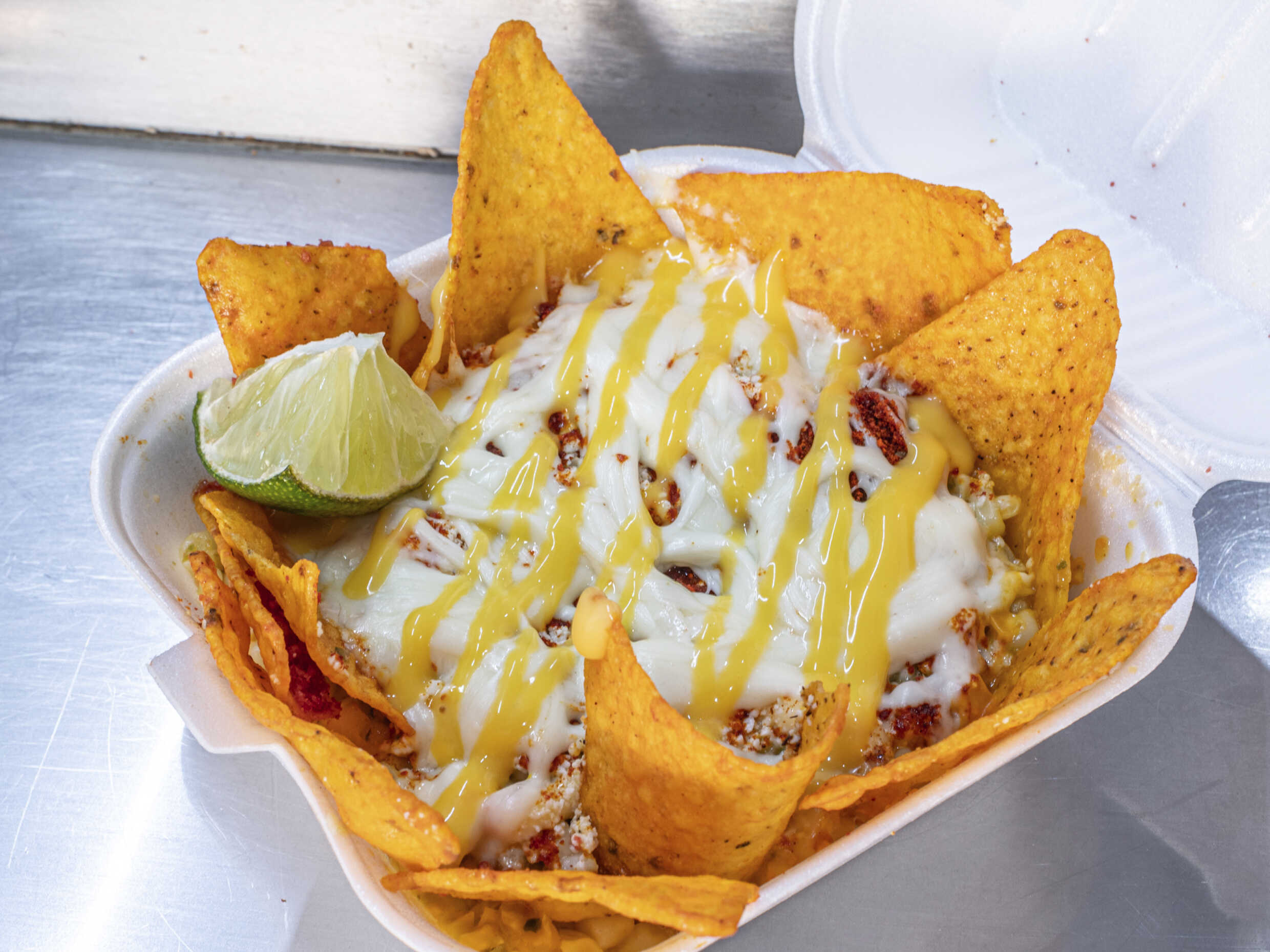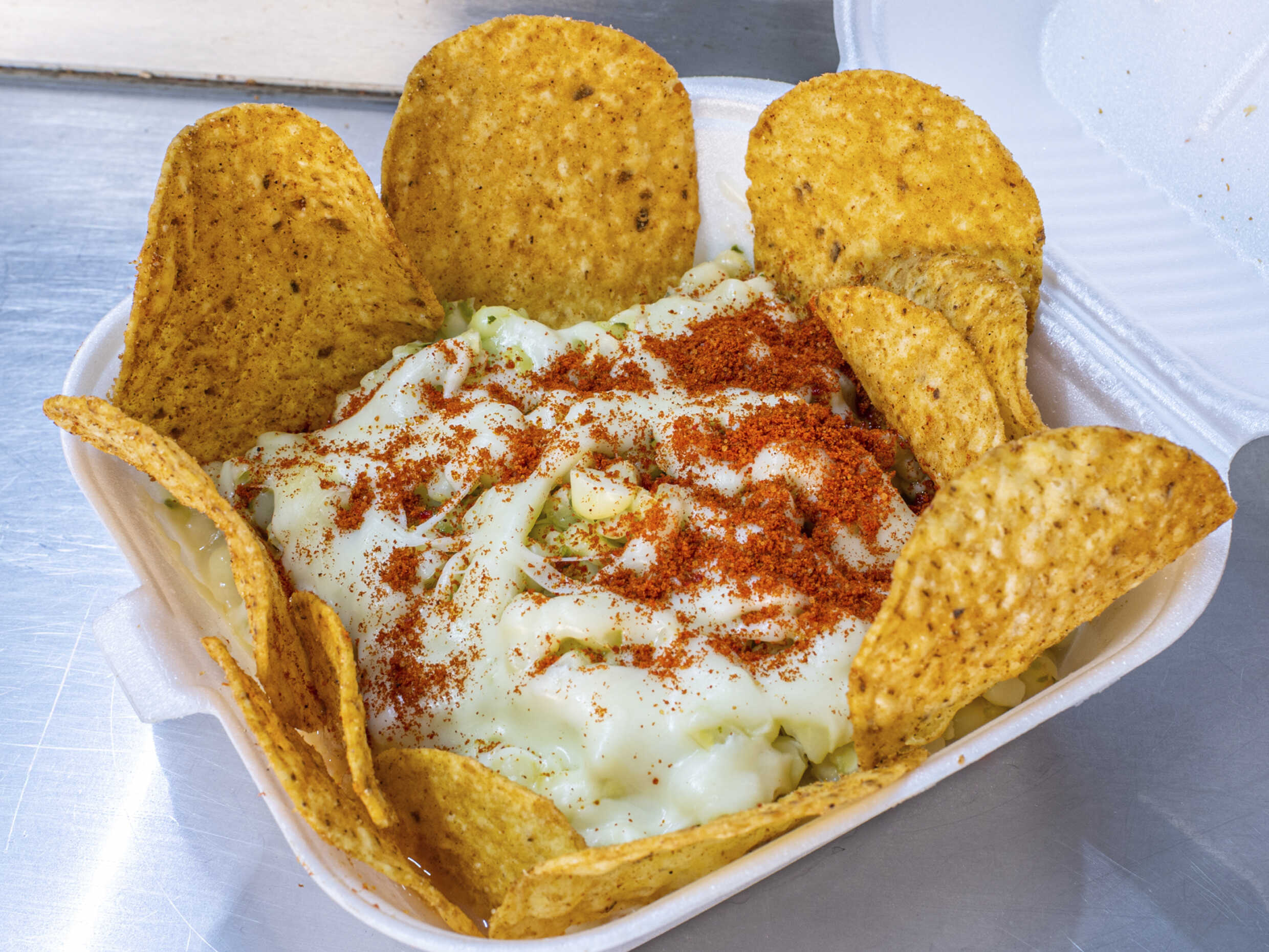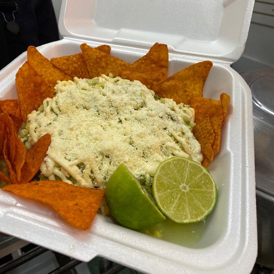 Elote con mayonesa, queso cotija, limón, takis o cheetos molidos, queso amarillo, una cama de esquites preparados y doritos alrededor
