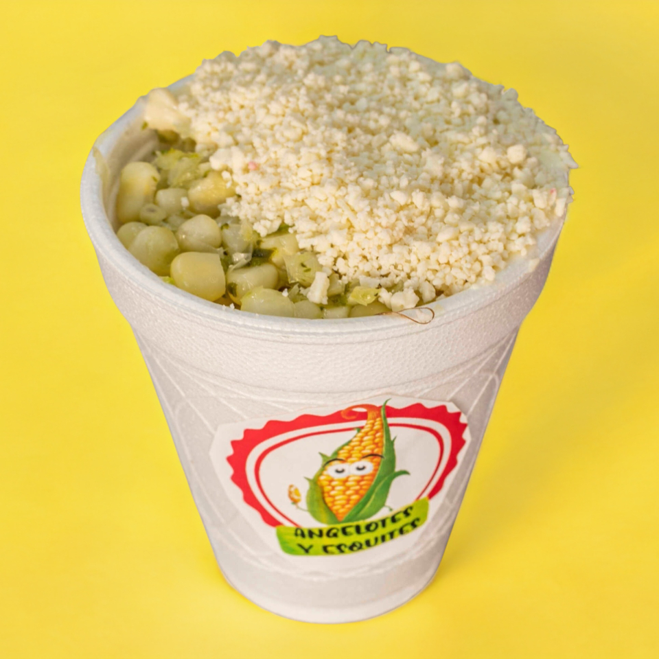 Esquites con mayonesa, queso cotija, quesillo fundido, queso amarillo, limón y chile