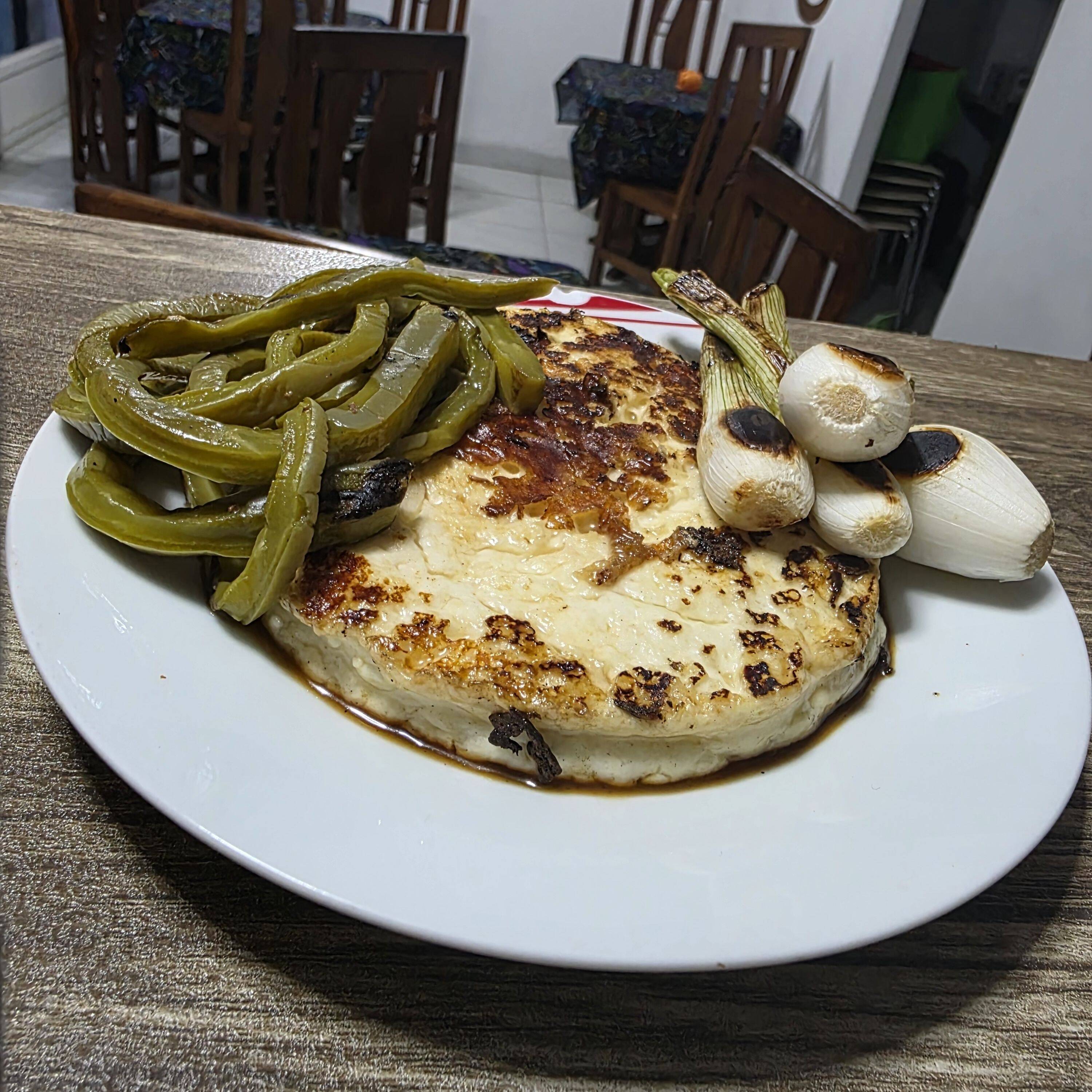 Delicioso queso redondo asado acompañado de nopales y cebolla