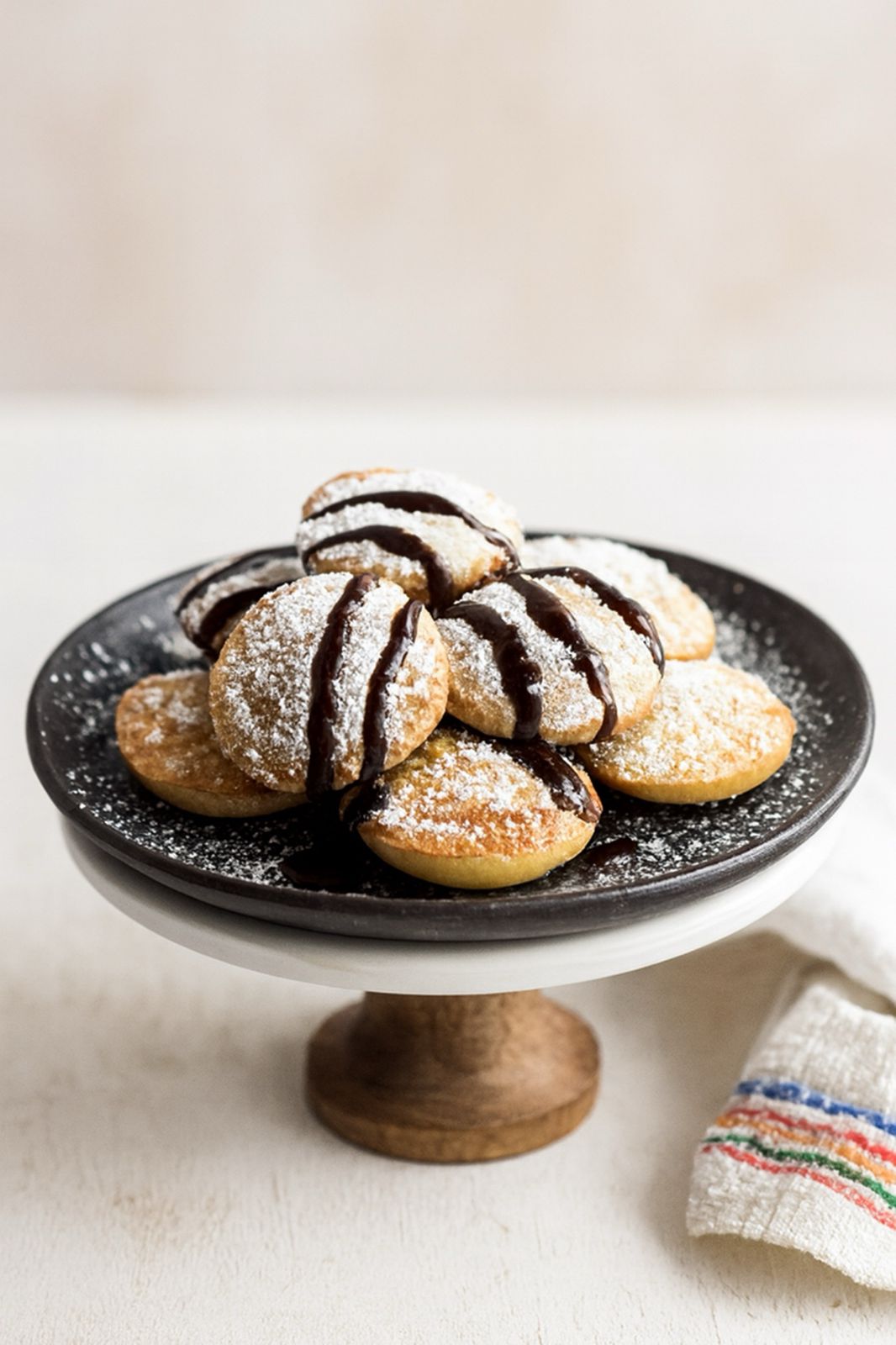 12 Mini hotcakes estilo holandés. Se sirve con azúcar glass y chocolate liquido.