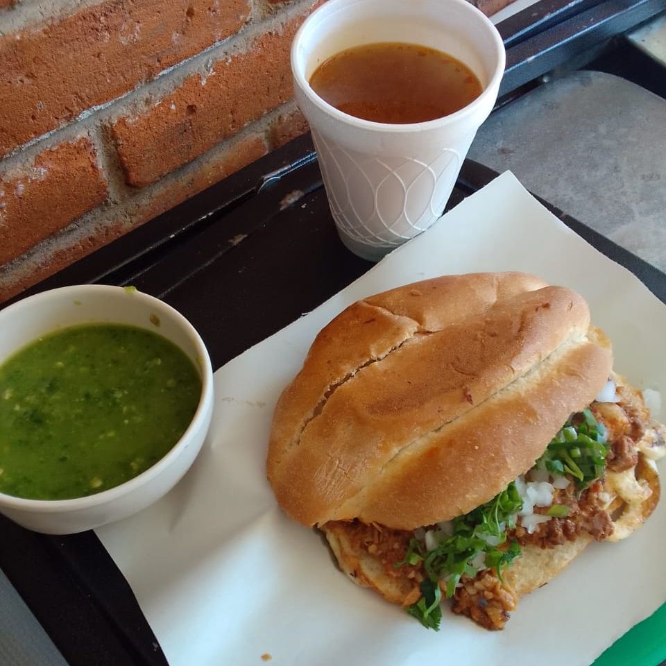 Torta de birria con queso gratinado, Incluye vaso de consome de 200 ml
