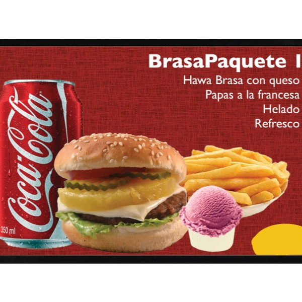 Hawa Brasa con queso, papas a la francesa, helado (chocolate, fresa, vainilla) y refresco (coca, sidral, fanta, sprite, delaware, fresca, coca sin azúcar)