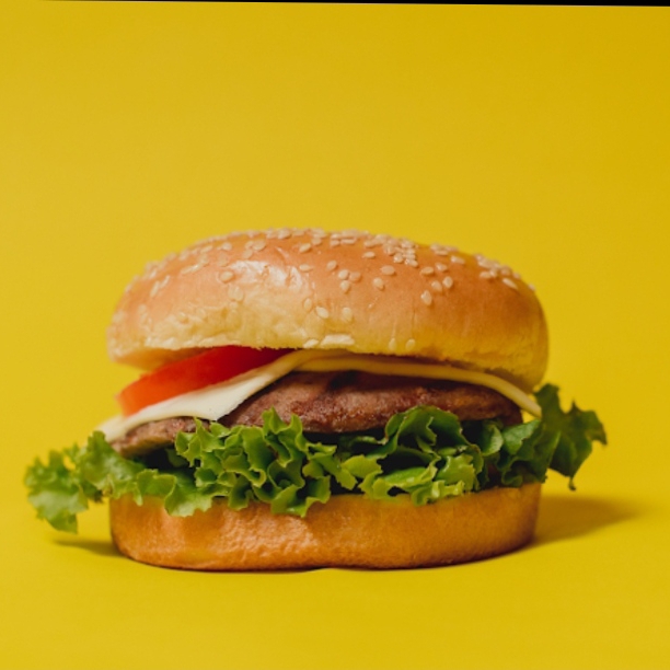 Hamburguesa 100% de res asada al carbón, con queso manchego, lechuga, jitomate, mostaza, mayonesa y catsup. Pepinillos, cebolla y picante opcional
