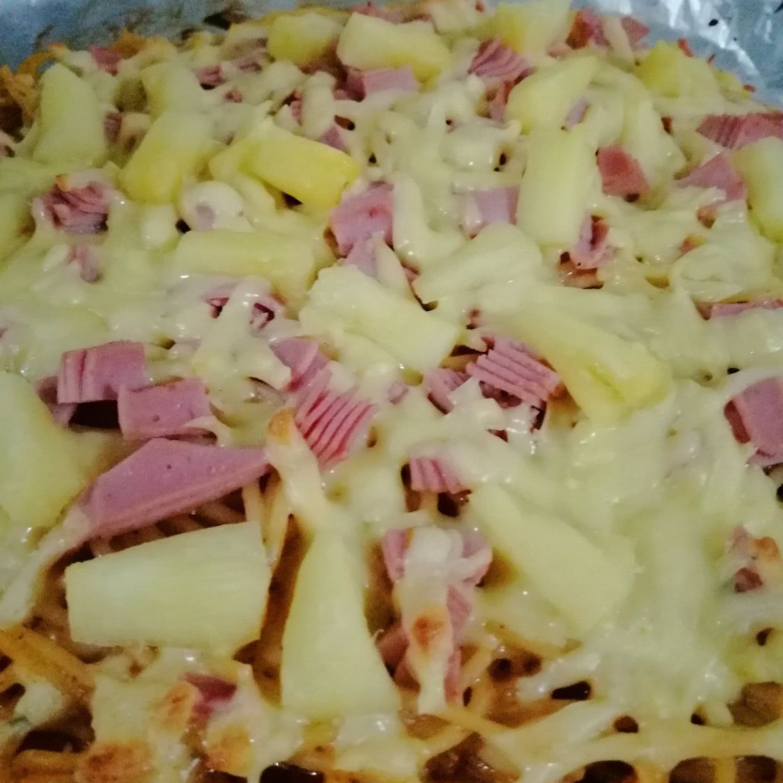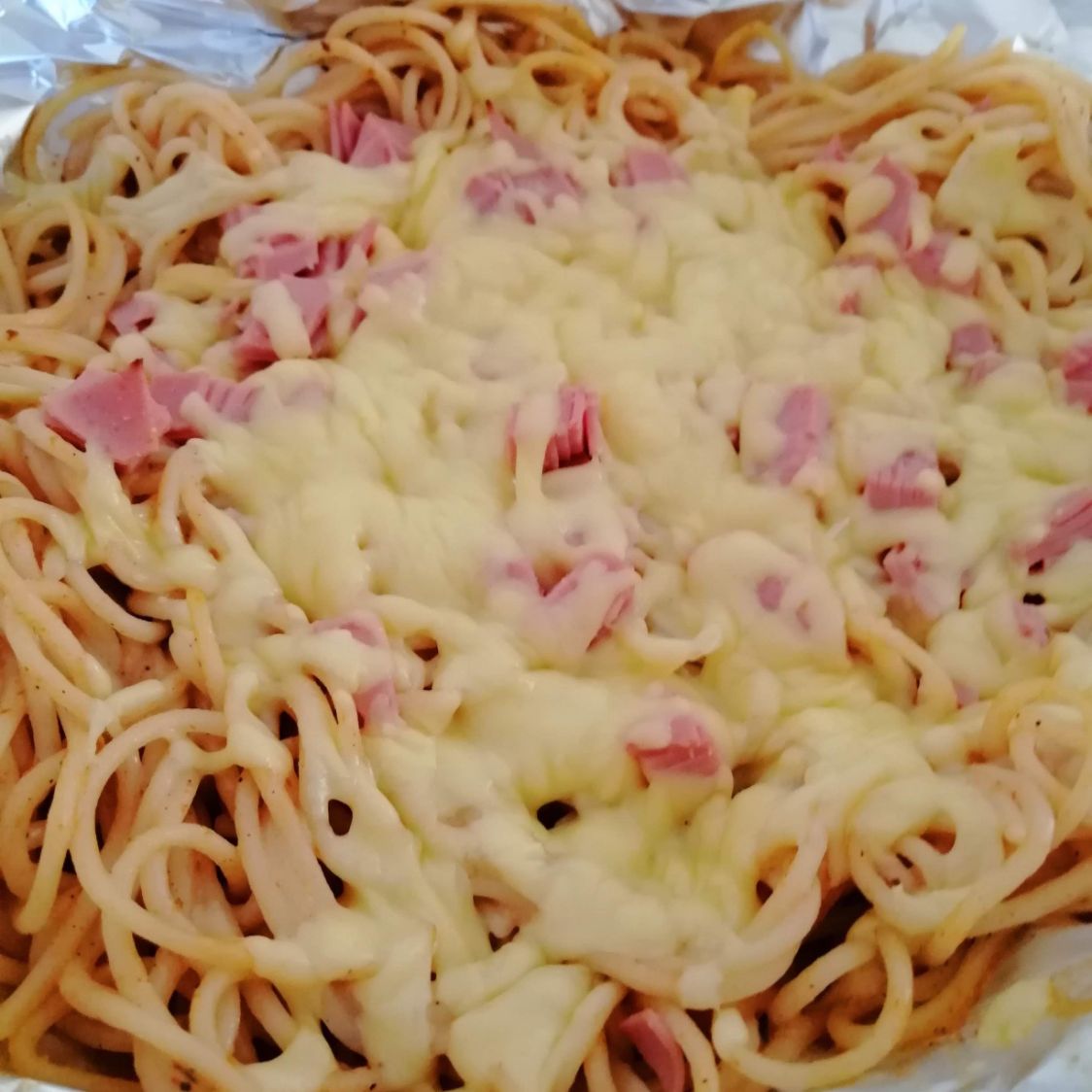 Espagueti con crema salsa de la casa jamon piña y queso cocinado al horno