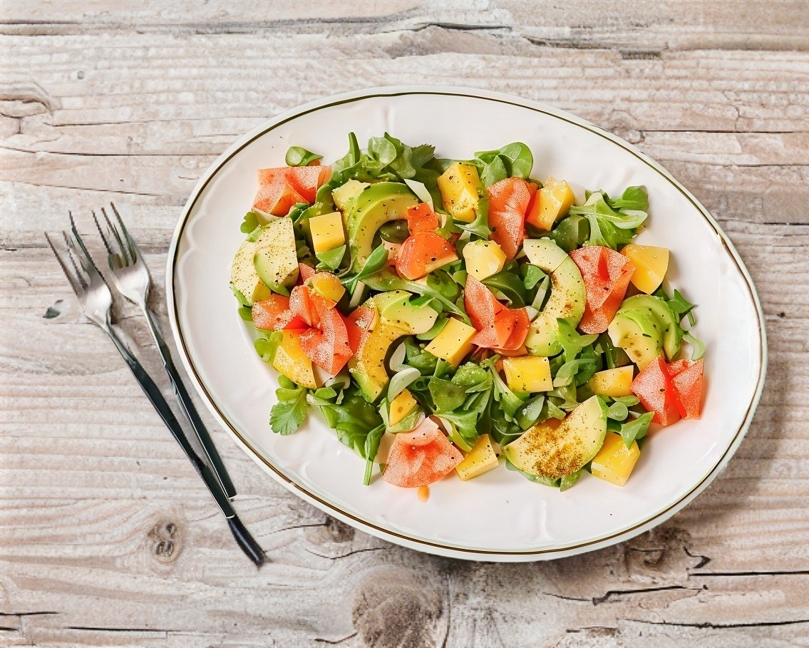 Mezcla de espinacas, pera, mango, manzana, ojonjoli caramelizado, queso de cabra y vinagreta
