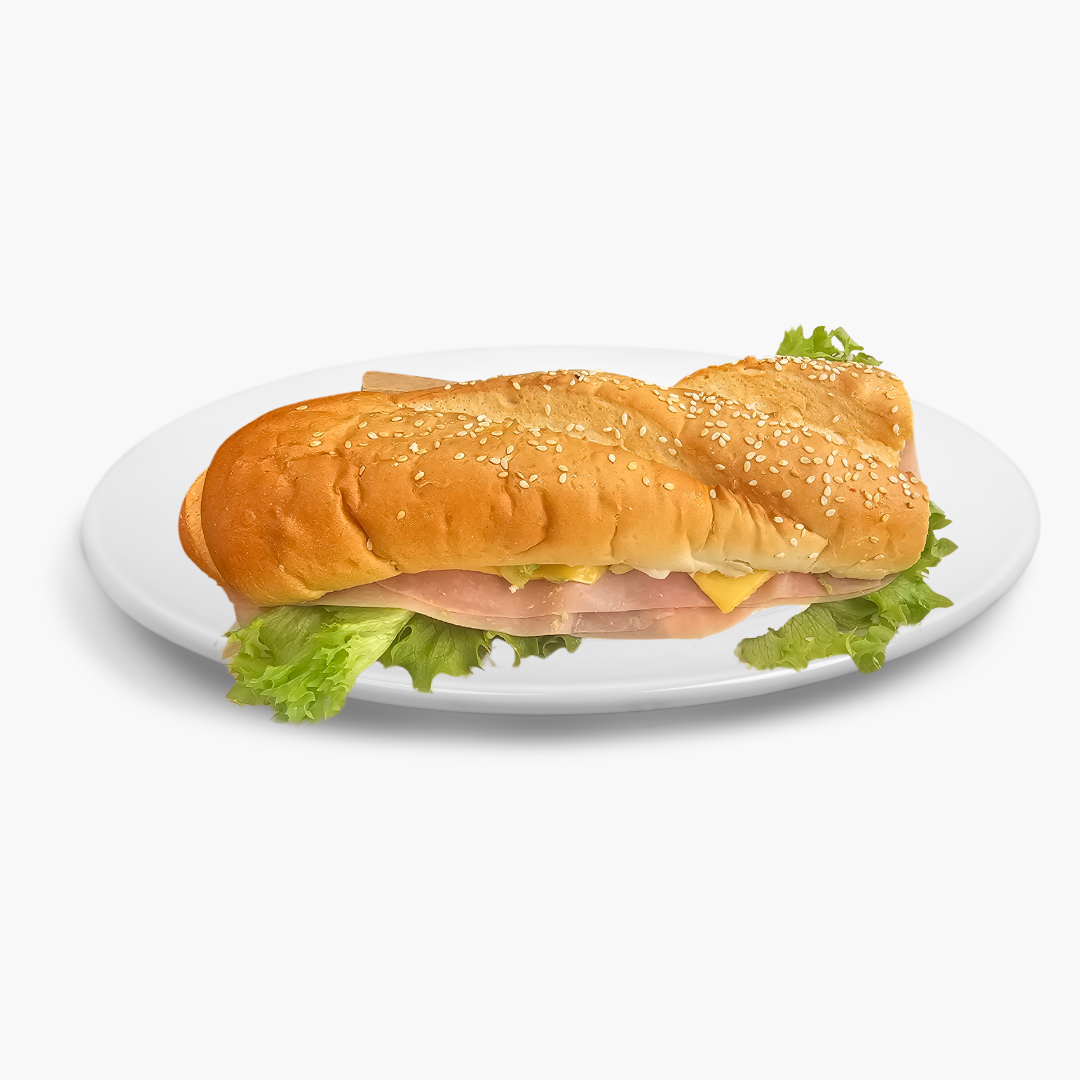 Elaborado con pan de baguette calientito, elaborado con lechuga orejona, jamón de pavo, quesillo, que amarillo
