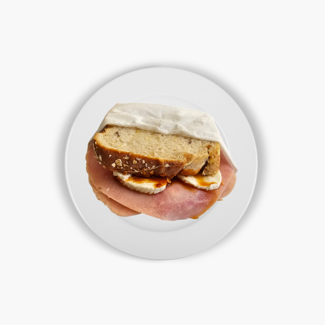 Sándwich con pan Bimbo artesanal, jamón de pavo, quesos amarillo, panela, Uruhuayo, quesillo