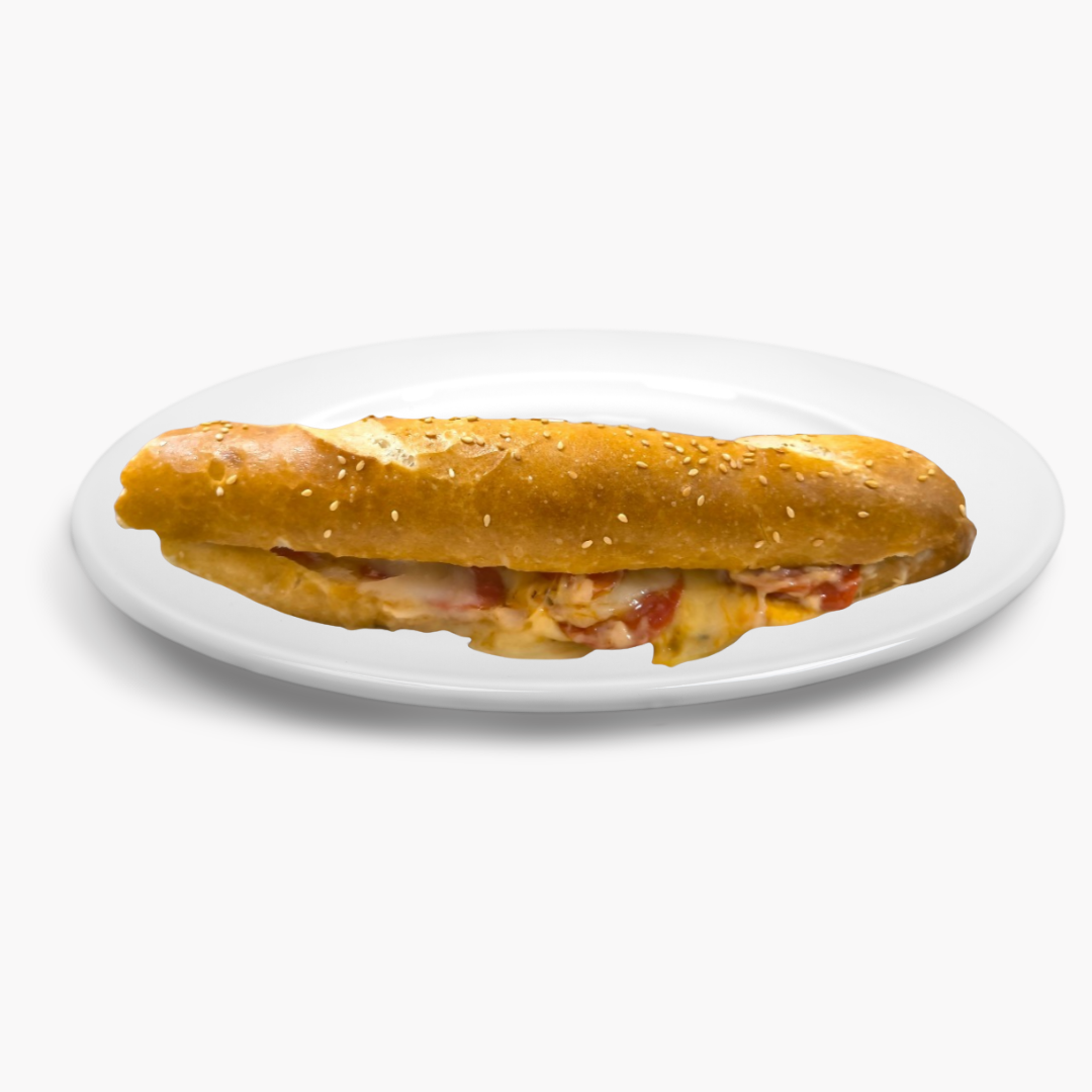 Elaborado con pan baguette calientito, base de salsas de tomate, queso mozarella, Uruhuayo, peperoni, jamón.