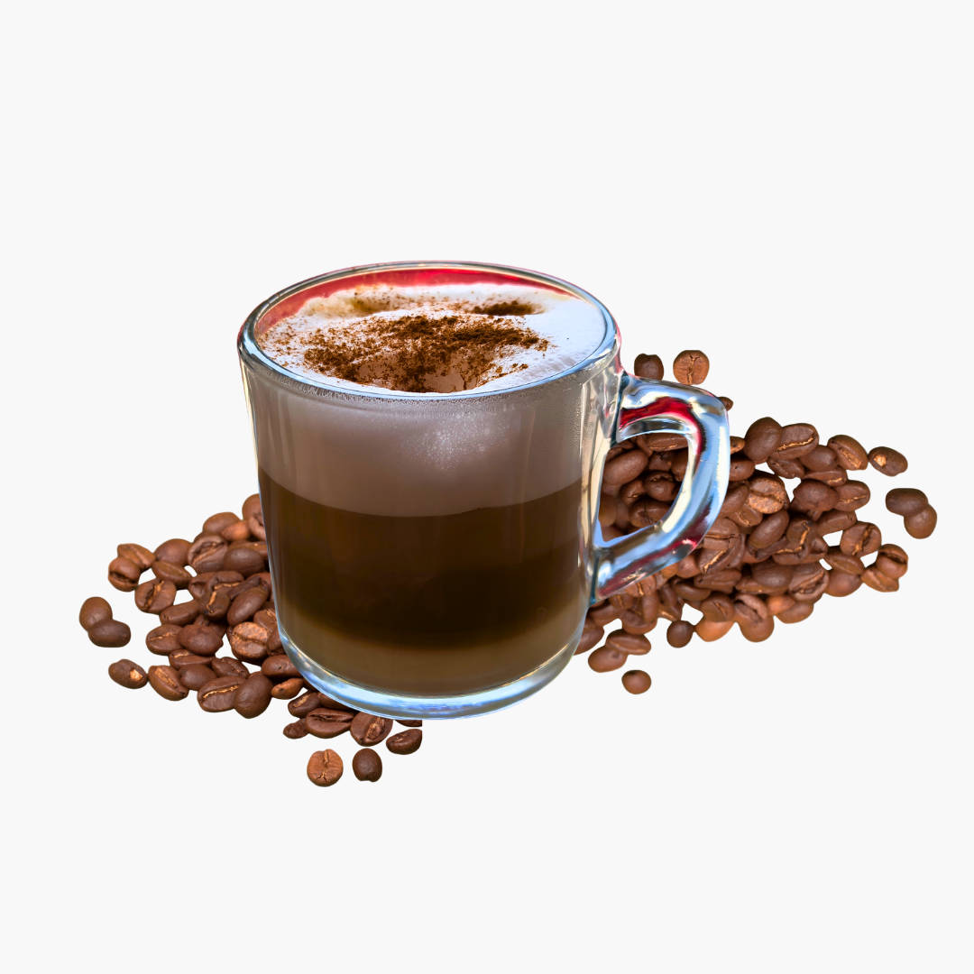 Tercios iguales de espresso, leche vaporizada y espuma de leche, con un toque de canela. Elaborado con café en grano. Presentación de 12 oz.